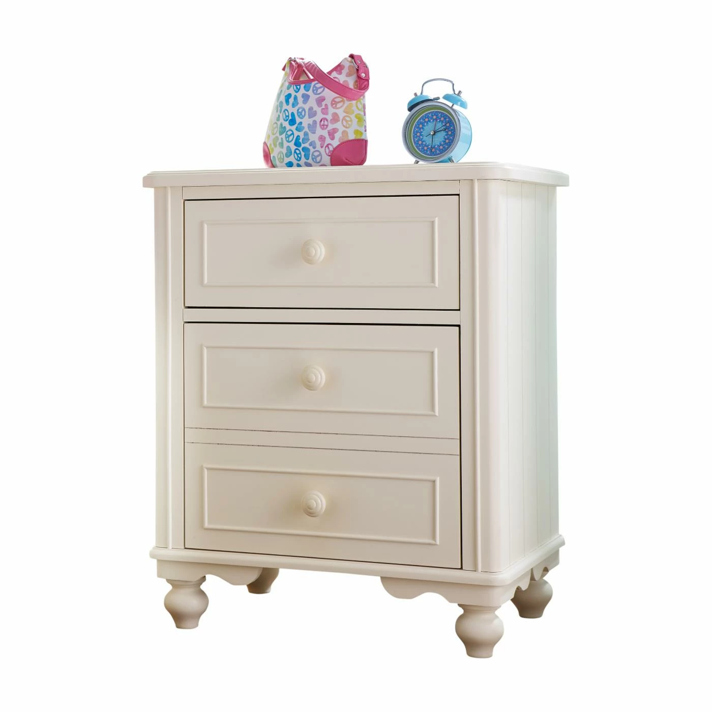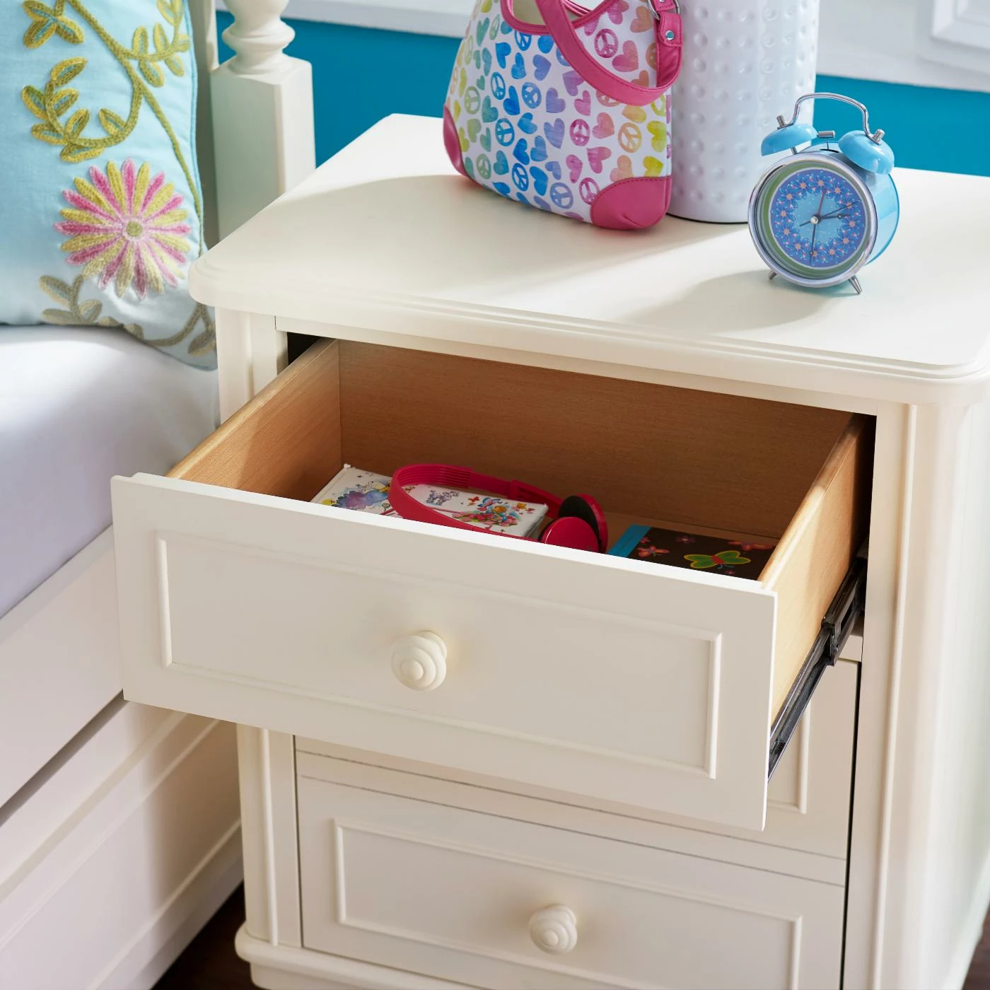 Top the LC Kids Summerset Night Stand – Ivory with a table lamp and fill it with bedtime essentials. This nightstand is durably constructed of poplar solids and birch veneer. It’s covered with an ivory painted finish and supported by bun feet. The three storage drawers open with round, spiraled pulls. Pair it with other items from the Summerset Collection for a coordinated look.