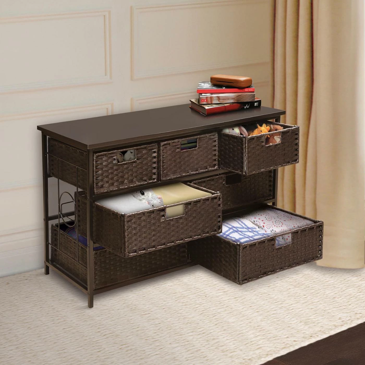 Your home will stay neat and organized with the Badger Basket August Seven Basket Storage Unit. The seven metal baskets, four large and three small, are perfect for storing anything from gloves and scarves in the entryway to toys in the living room to craft items in the den. With a frame and shelf supports made with coated steel tubing and an engineered wood top panel that’s perfect for displaying keepsakes and photos, this storage unit is made to last. Its warm, non-toxic espresso finish complements almost any decor, and you can even combine multiple units to make one large storage area. Each basket is fully removable for cleaning and sorting and stopper bars prevent the baskets from accidentally being pushed out the back. A great addition to any home, the only question you’ll have is how many you need.