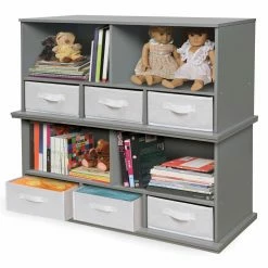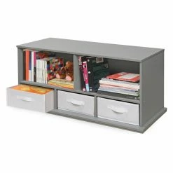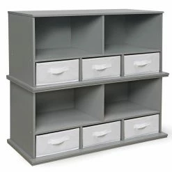With two cubby spaces and three storage baskets, the Badger Basket Shelf Storage Cubby with 3 Baskets – Gray provides easy-access storage space for toys, art supplies, and more. Its classic gray hue is casual and neutral for easy pairing with any dรฉcor. Durably constructed from engineered wood with metal hardware, this cubby features fabric storage baskets reinforced with cardboard. Create a larger organization station by stacking this cubby atop the Badger Basket 2-Bin or 3-Bin Storage Cubby.