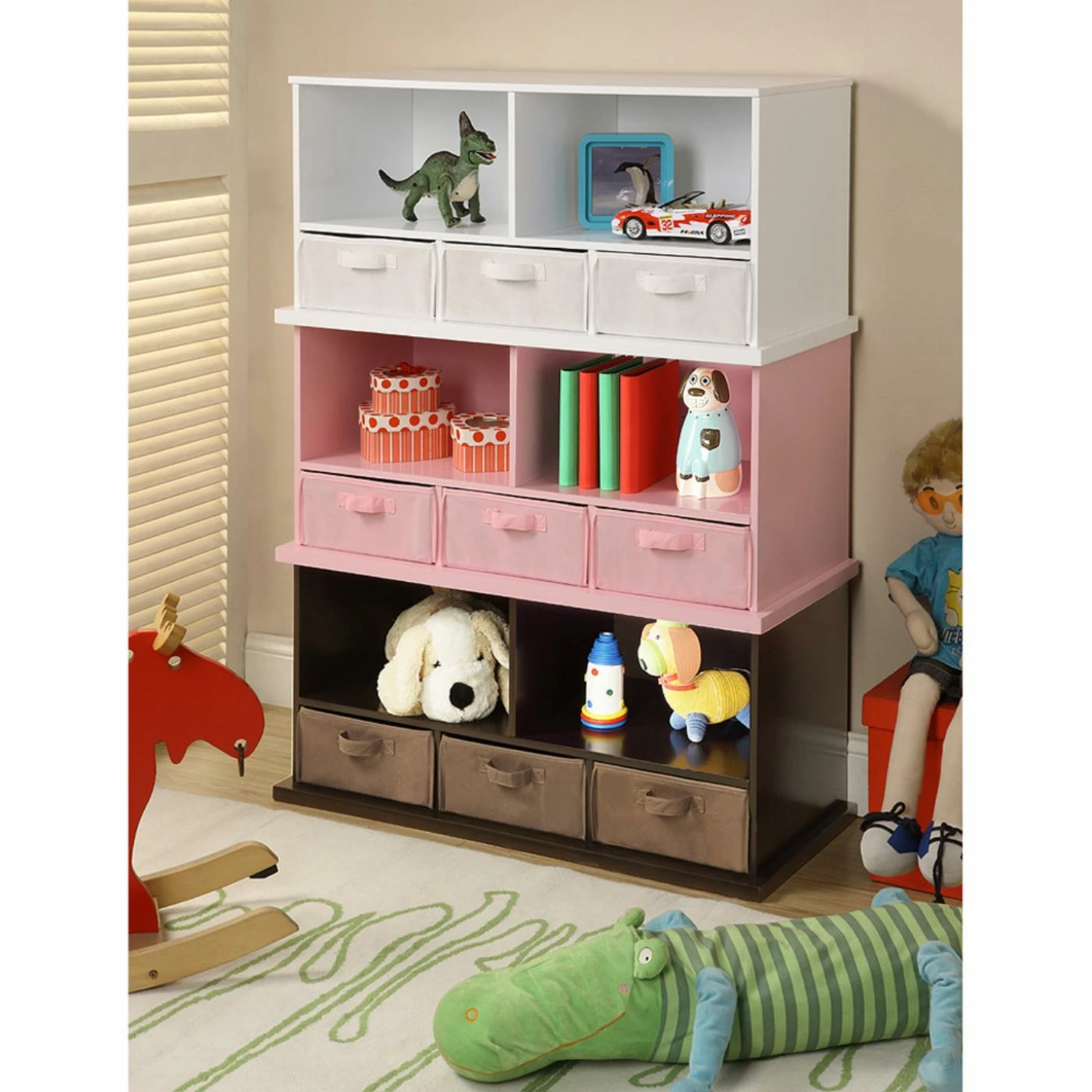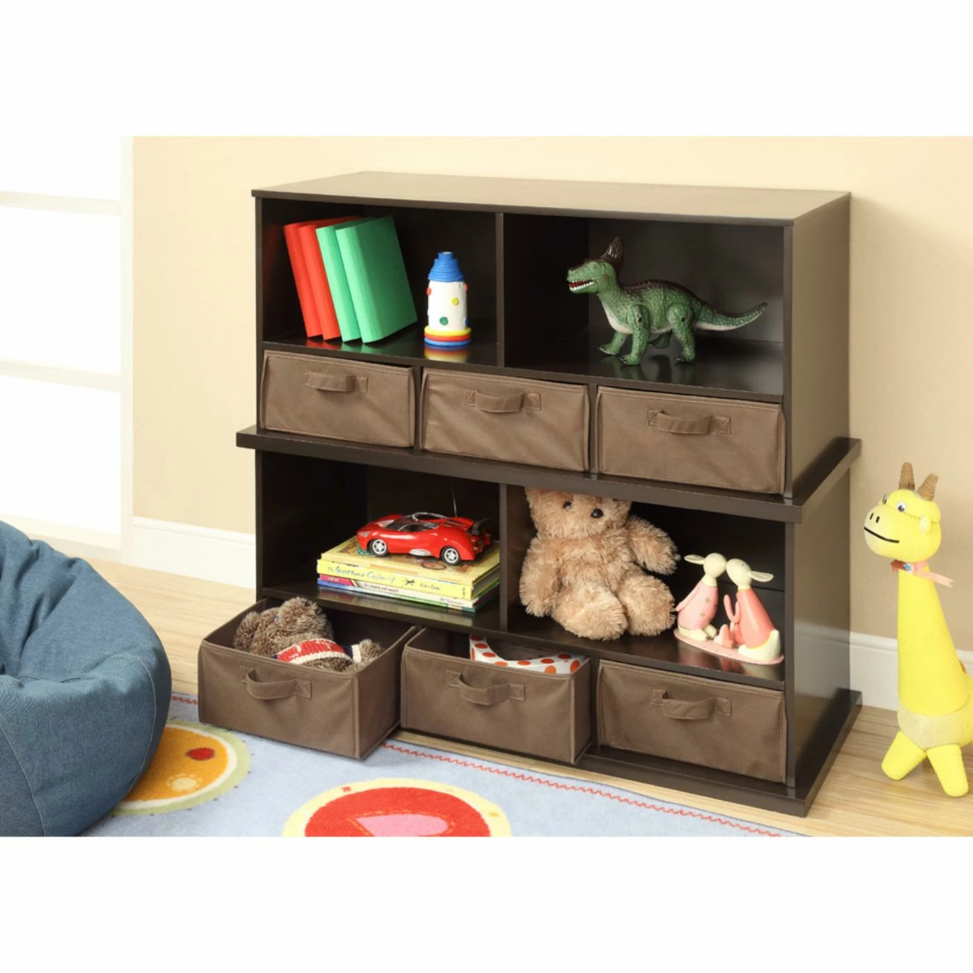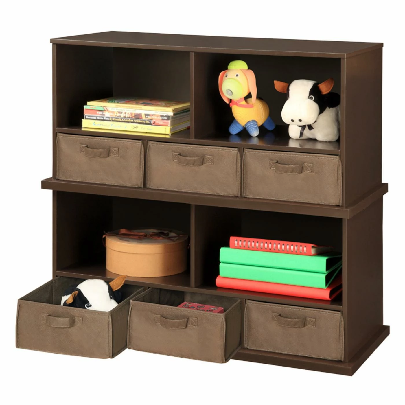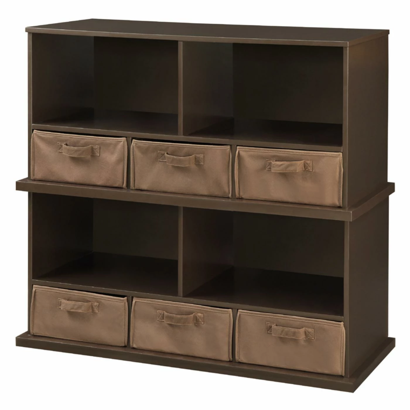 You wouldn’t make soup without a pot, so why would you try to organize without the storage of the Badger Basket Shelf Storage Cubby with Three Baskets – Espresso? Keeping everything where it belongs is Job #1, and this versatile storage unit is up to the task. Crafted from durable, engineered woods, this unit features a pair of spacious, open compartments up top and a trio of smaller compartments at the bottom. Each of the smaller compartments comes appointed with a deep, handled basked that’s perfect for storing media or loose objects that just need a home. Each deep basket is covered in an appealing cotton/polyester fabric with internal supports of industrial cardboard, making them ideal for toys or smaller, loose items. The baskets also sport convenient handles and can be removed for added storage around your home. The body of the cabinet is crafted from durable, warp-free engineered woods that are given a traditional finish of rich brown that can complement any home decor style. This unit is also ideal for children, as it offers plenty of storage at a height that any child can navigate. If you love this look but wish there was more of it, you’ll be pleased to know this unit is also stackable. Some assembly is required, but detailed instructions are included and all you need is a screwdriver.