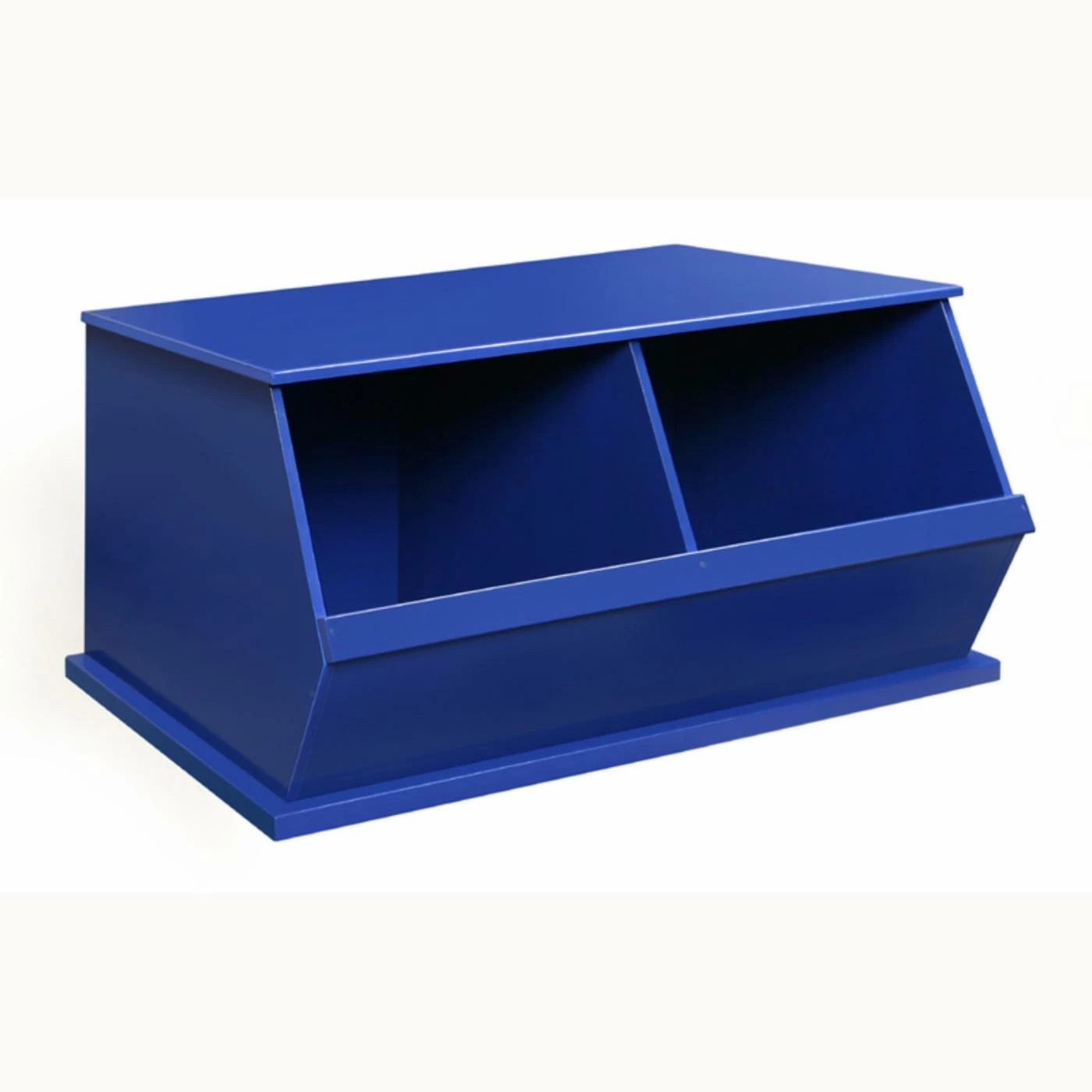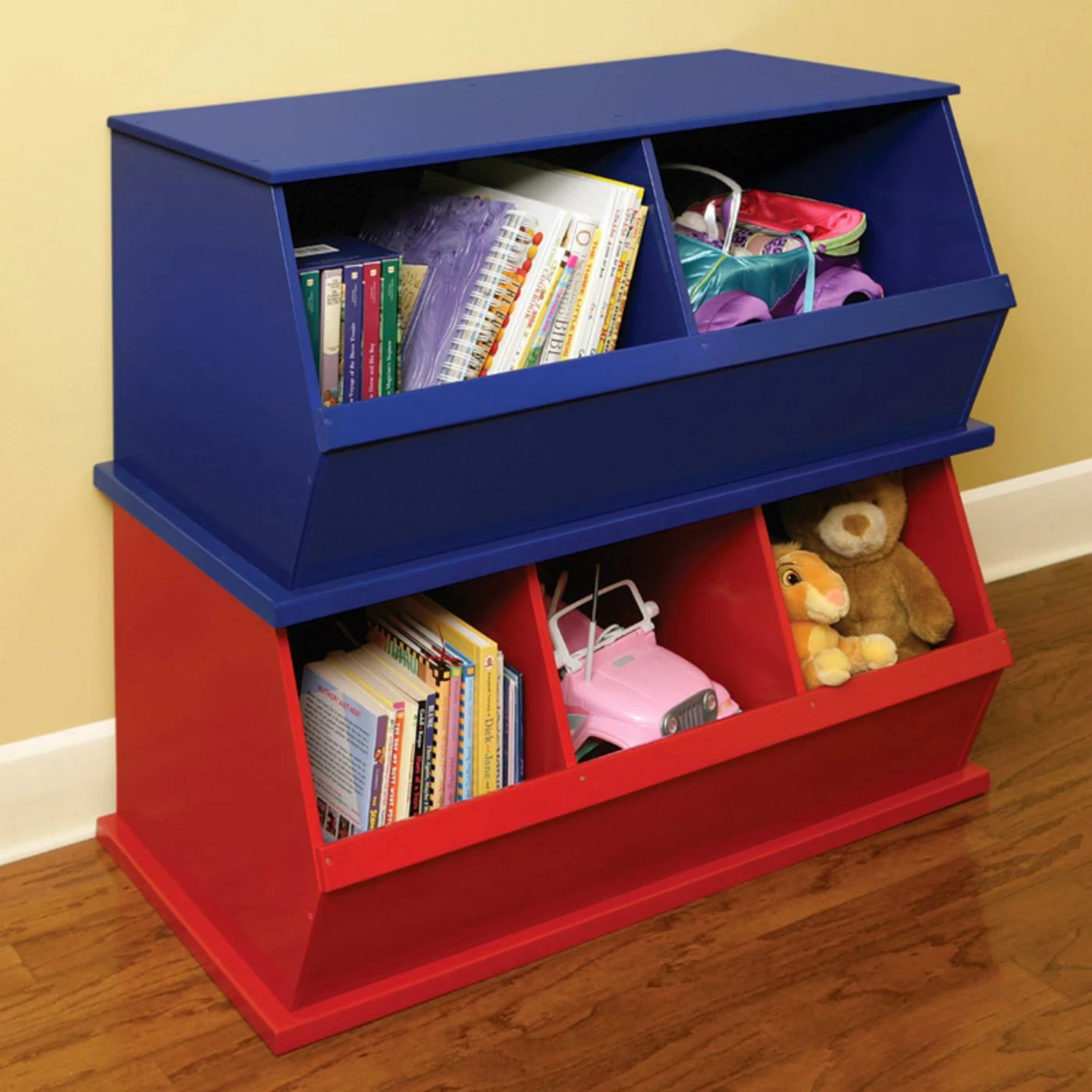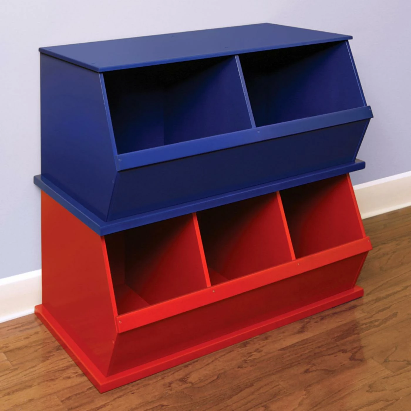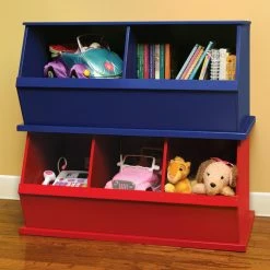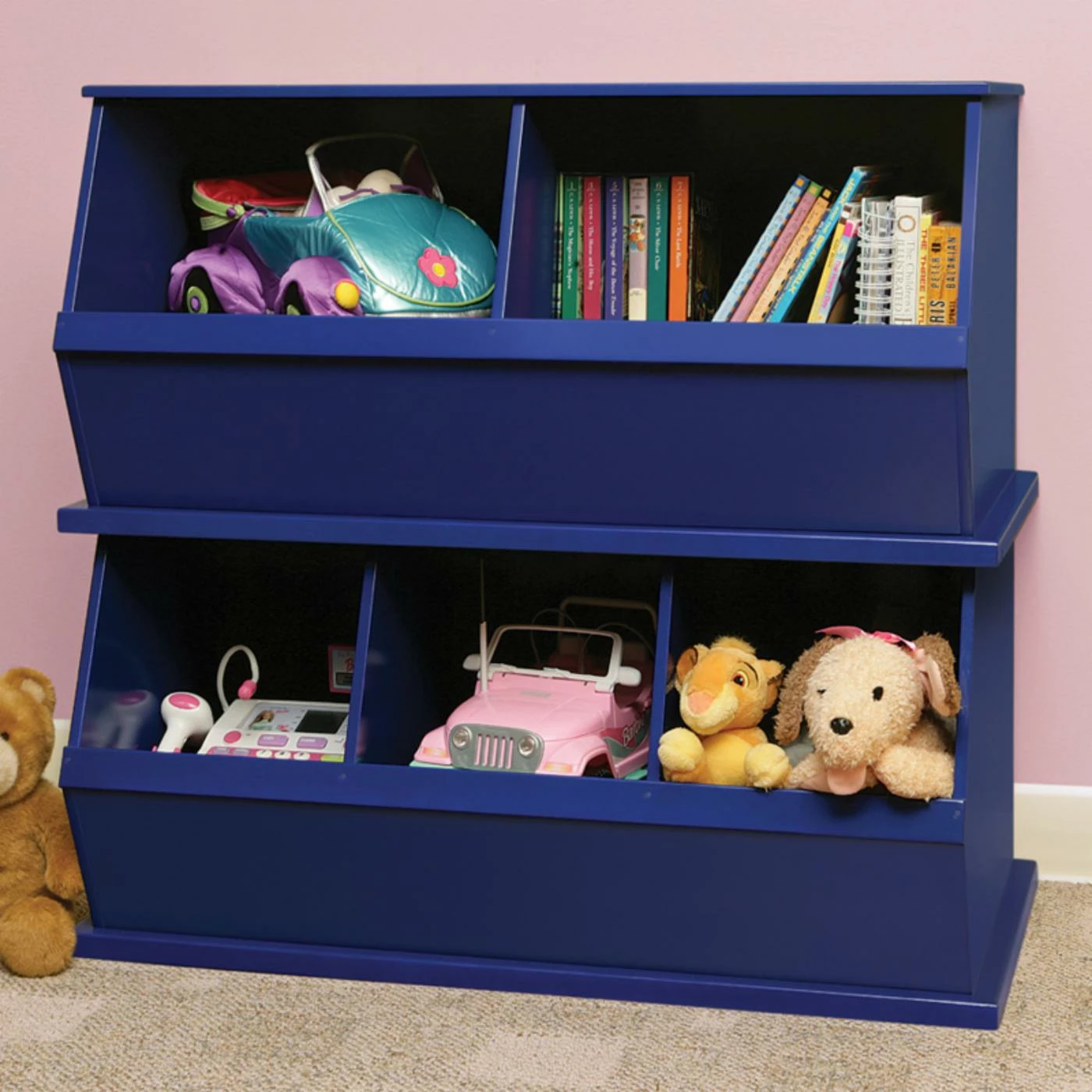 Stack and store with the Badger Basket Two Bin Storage Cubby – Blue. This is a perfect addition to your daycare or home. It features two large cubby spaces that make it easy for kids to load and unload toys, books, winter accessories, craft supplies, and more. It is strong enough to stand up to your kids and is easy to clean, too. Simply wipe clean with a damp cloth and mild detergent when needed. Maybe best of all this cubby is stackable for multiple levels of storage! Each bin measures 16.75W x 17.5D x 15.6H inches and is made of sturdy wood composites with metal hardware. This cubby comes in a rich blue non-toxic painted finish. It complies with all current, applicable ASTM safety standards. If stacking three or more bins, we recommend using wall anchor/furniture safety straps (not included) to anchor the units to the wall for safety and stability. Tidy up!