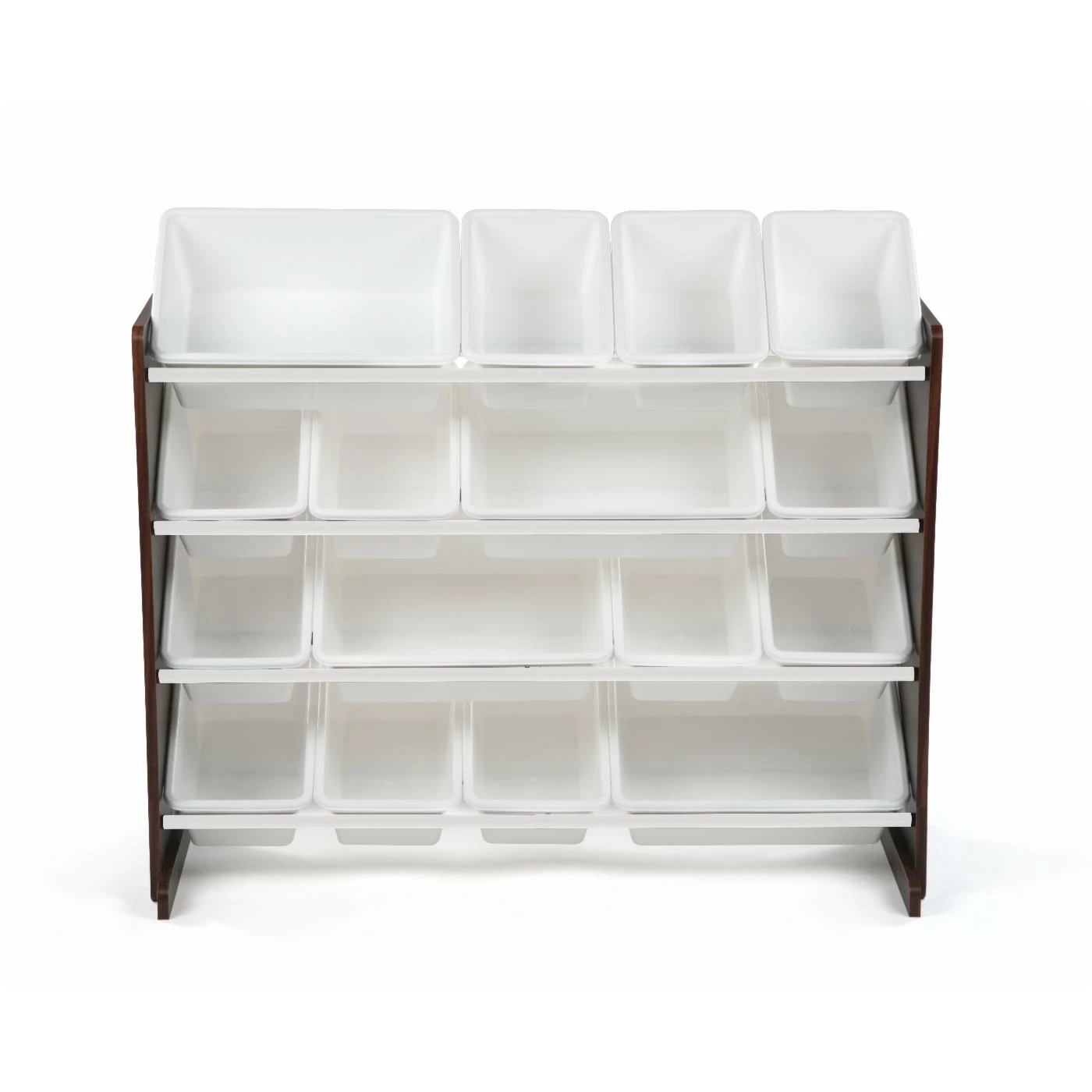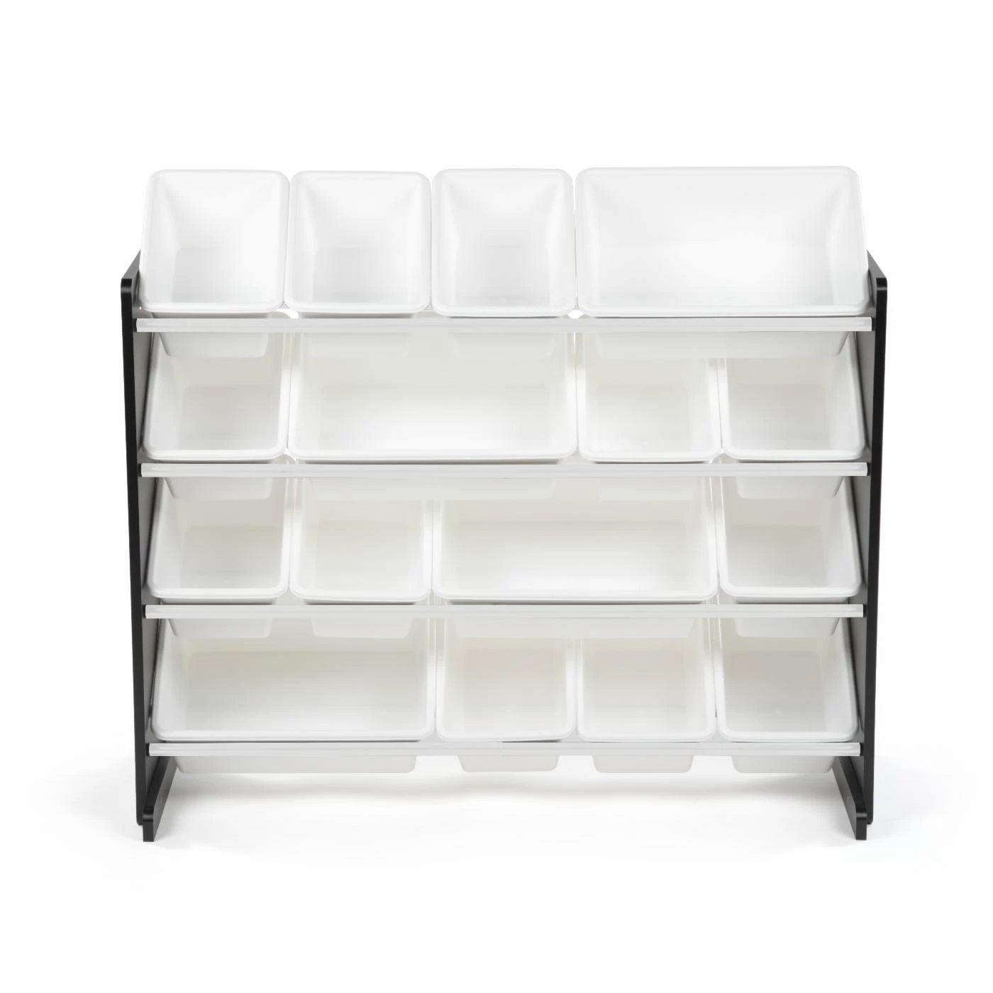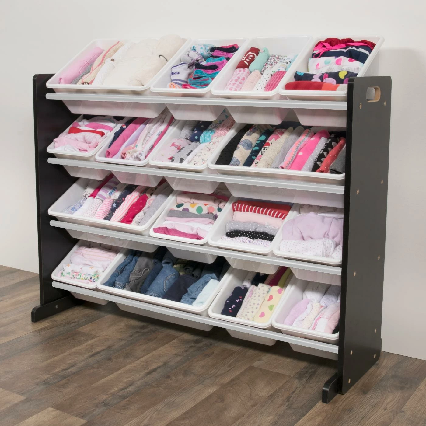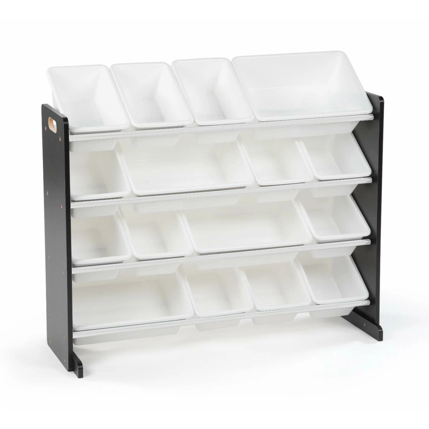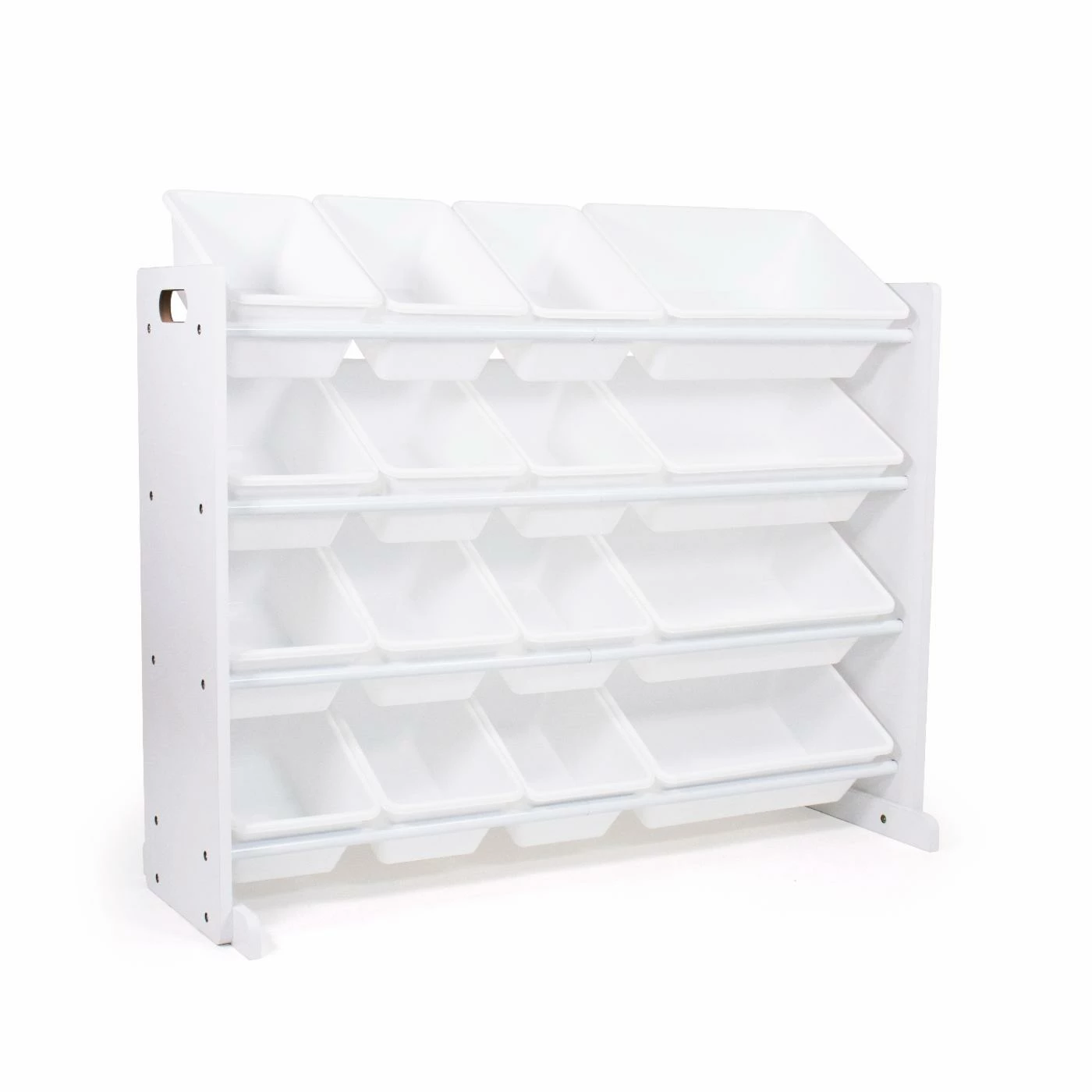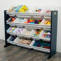 If you’re tired of stepping on dolls, blocks, and dinosaurs, the Tot Tutors 16 Bin Toy Organizer will help your little ones get organized. Twelve regular-sized bins and four double-sized bins are ready for toys, art supplies, balls, and more! The bins sit at an angle in the toy organizer for ready access. They can be removed to be washed and to make cleanup after playtime easier. The organizer comes in your choice of available colors and features stabilizing bases for security and steel rods for the bins. Add this toy organizer to your child’s playroom or bedroom.