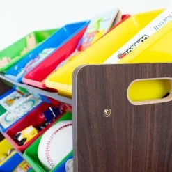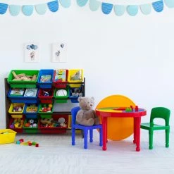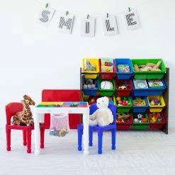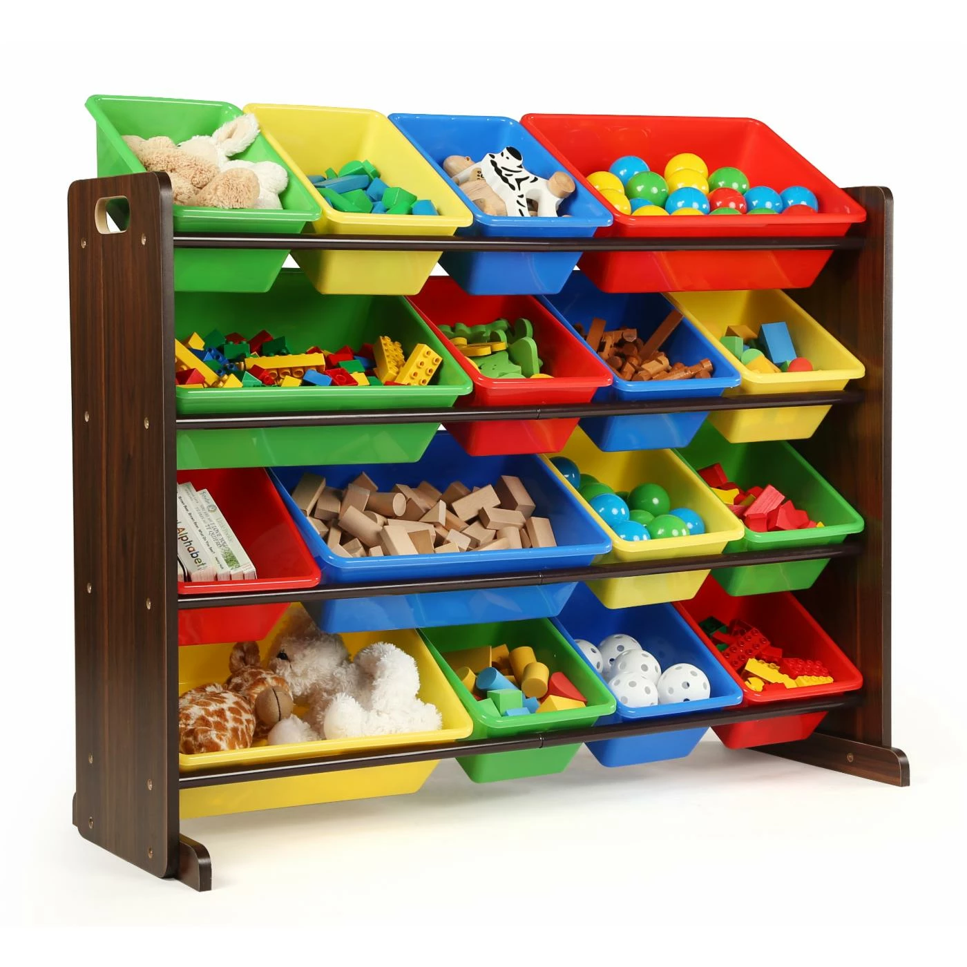 Store more toys in less space with the Tot Tutors Discover Super-Sized Kids Toy Storage Organizer with 16 Bins. The engineered wood organizer features 12 regular and four extra-wide plastic bins in bright primary colors. Steel braces increase the strength of the toy storage organizer.