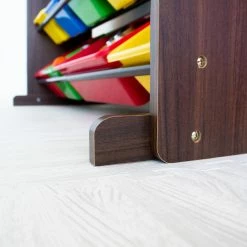 - Walnut finish with red, green, blue, and yellow bins