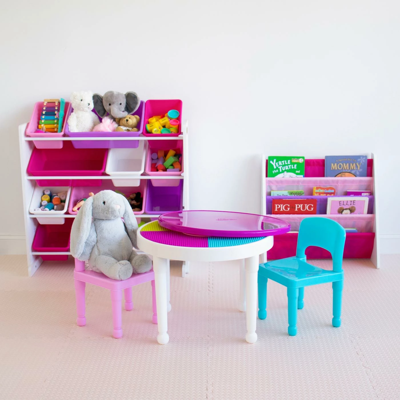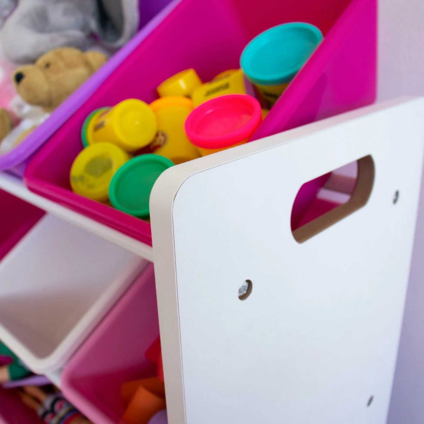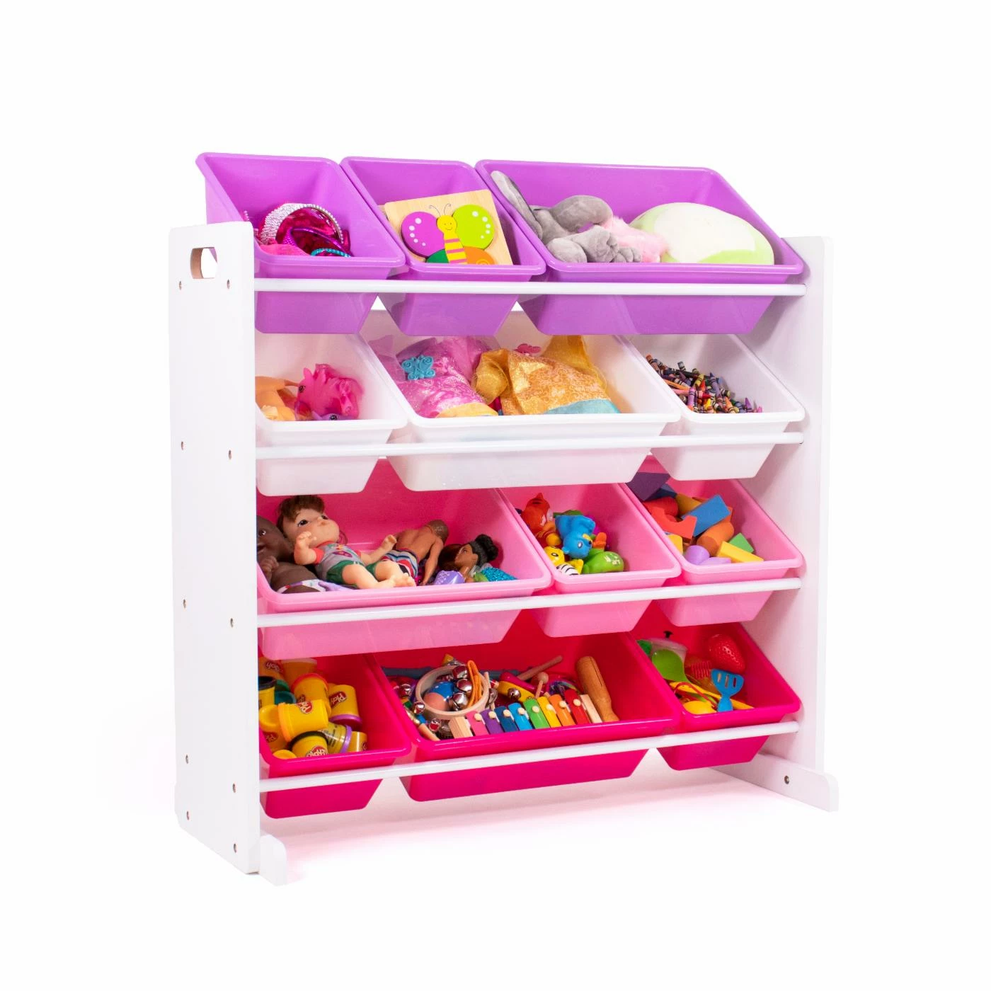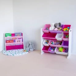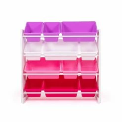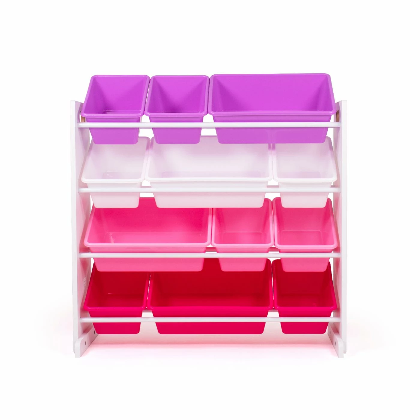 Save space in spunky style with the Tot Tutors Kids Toy Storage Organizer with 12 Bins – Pink/White. 8 standard-sized and 4 extra-large easy access storage containers, colored in various fun shades of pinks, purples, and whites, are removable from the wood support frame. Kids will have a blast pulling toys, games, books, and more out of this set, while at the same time learning how to organize and sort, which develops their cognitive skills tremendously.