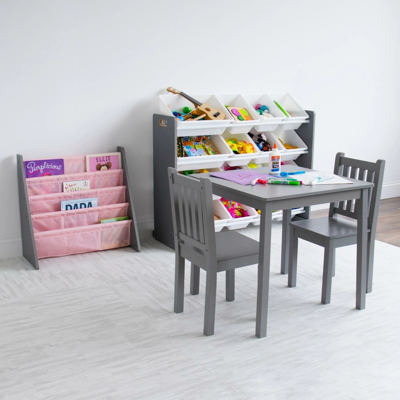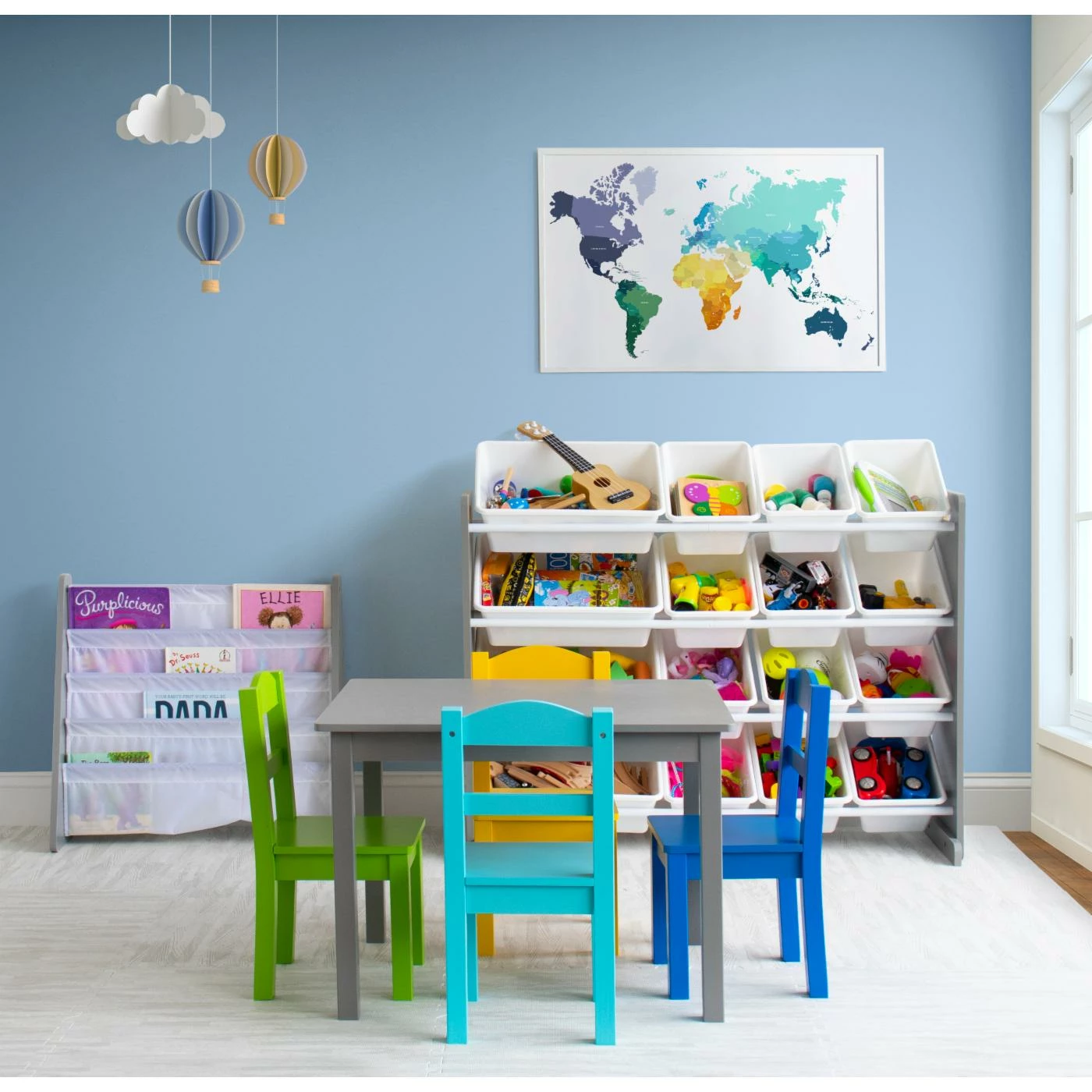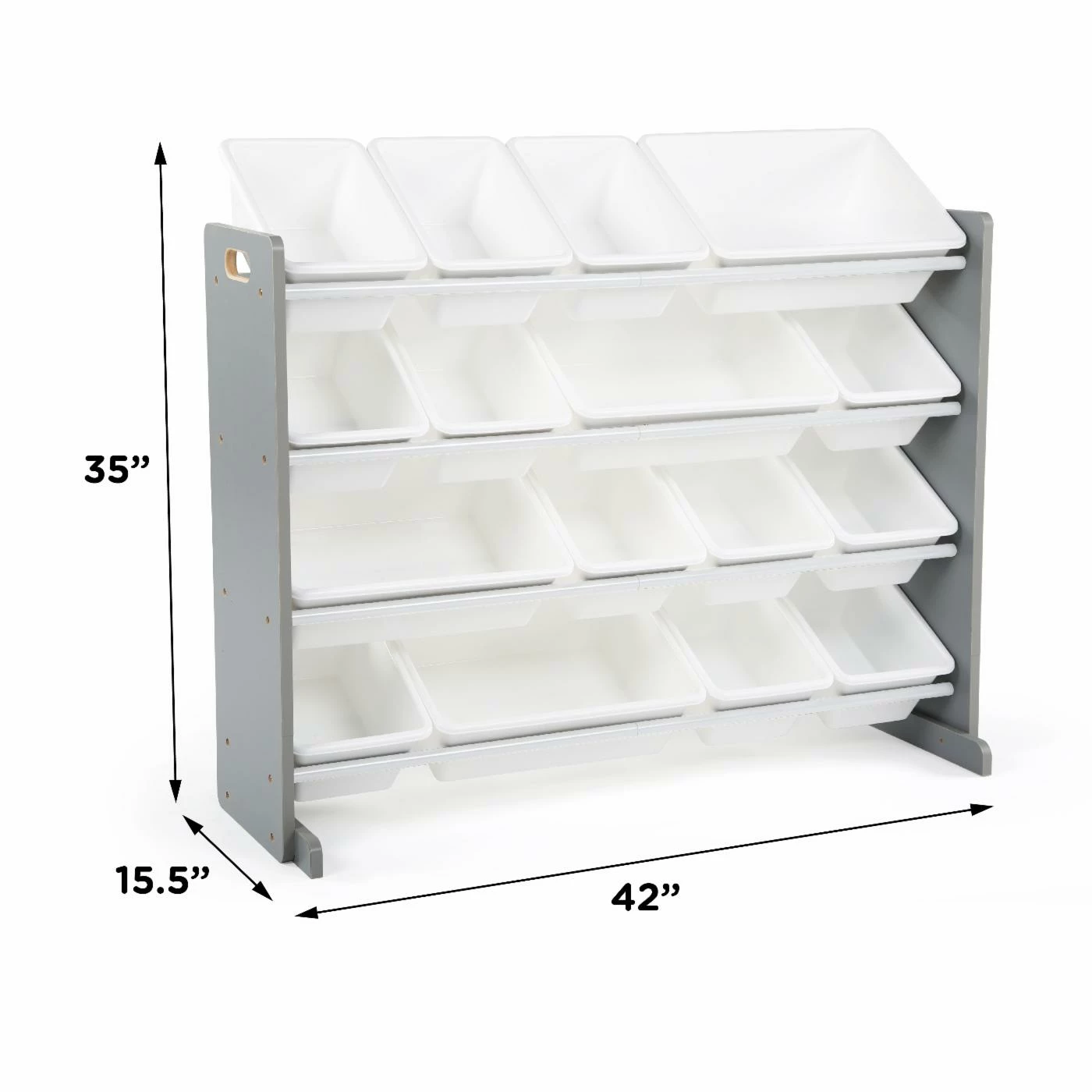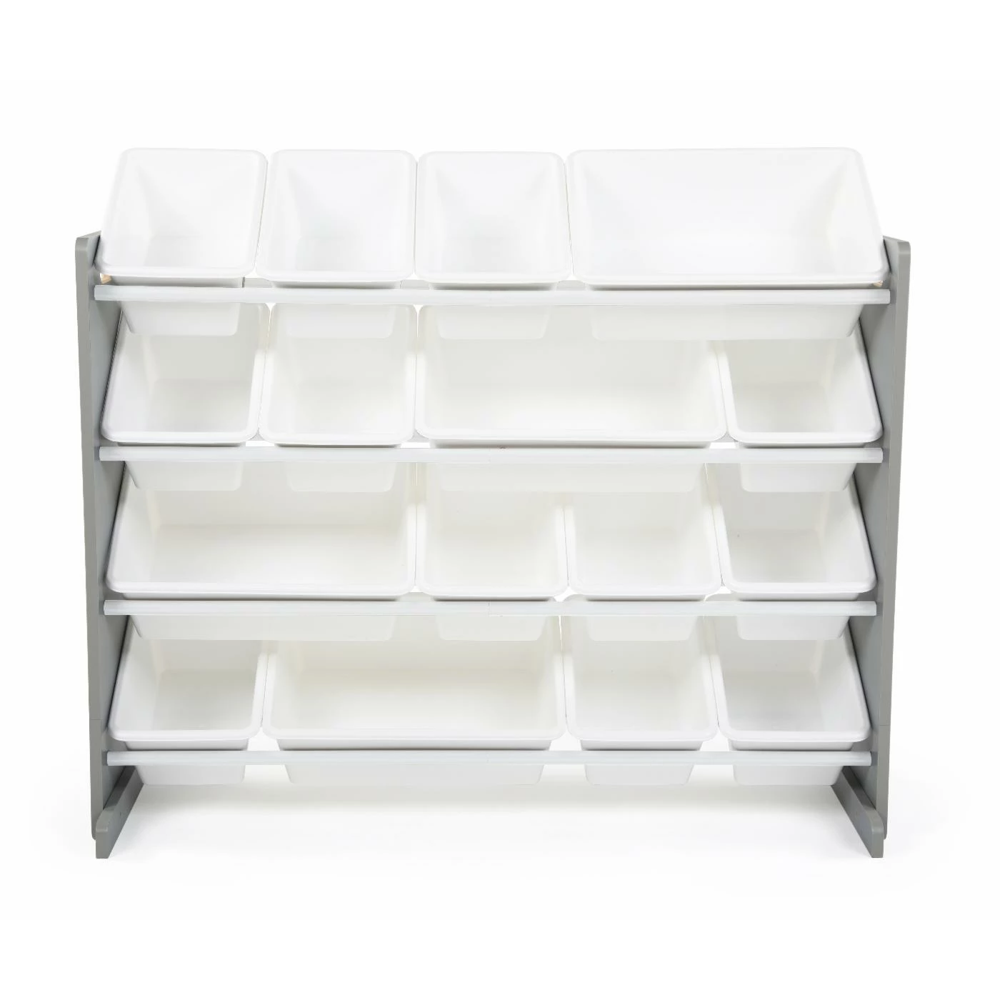 With its white and gray design, the Tot Tutors Springfield Super-Sized Kids Toy Storage Organizer with 16 Bins is a toy-storage solution that can complement any color palette. The engineered wood rack features four double-wide and 12 standard bins made of durable, easy-to-clean plastic. Steel braces provide extra strength to help the toy storage organizer stand the test of time.