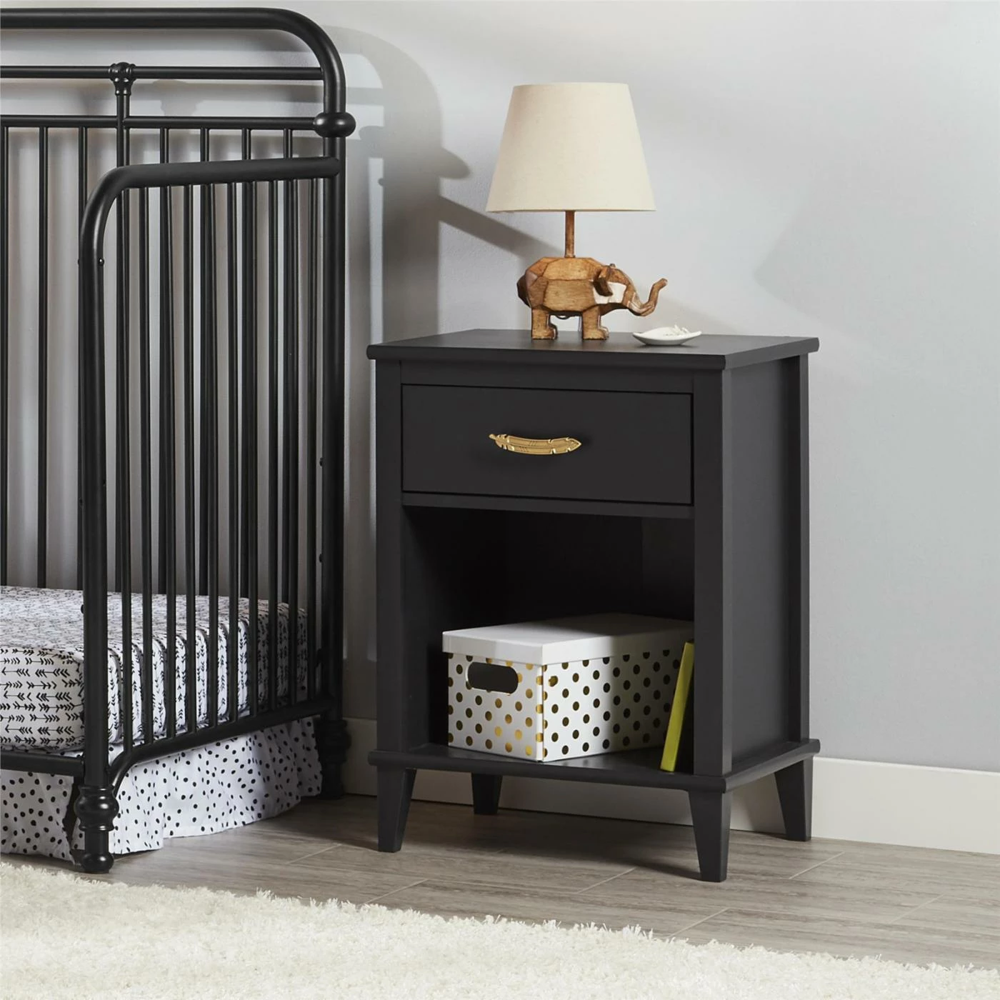 Provide a convenient crib- or bed-side storage area with the Little Seeds Monarch Hill Hawken Nightstand. This nightstand is ideal for a nightlight, lamp, or late-night supplies. A deep storage drawer lets you keep important items safely stowed while the open lower shelf area allows you to keep storybooks and storage bins organized. The frame is built from thick engineered wood with a black finish. A metal handle outfits the drawer, molded into a feather shape and finished in gold.