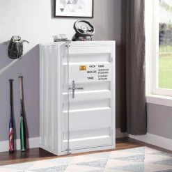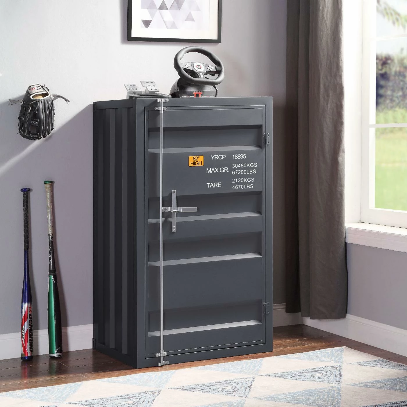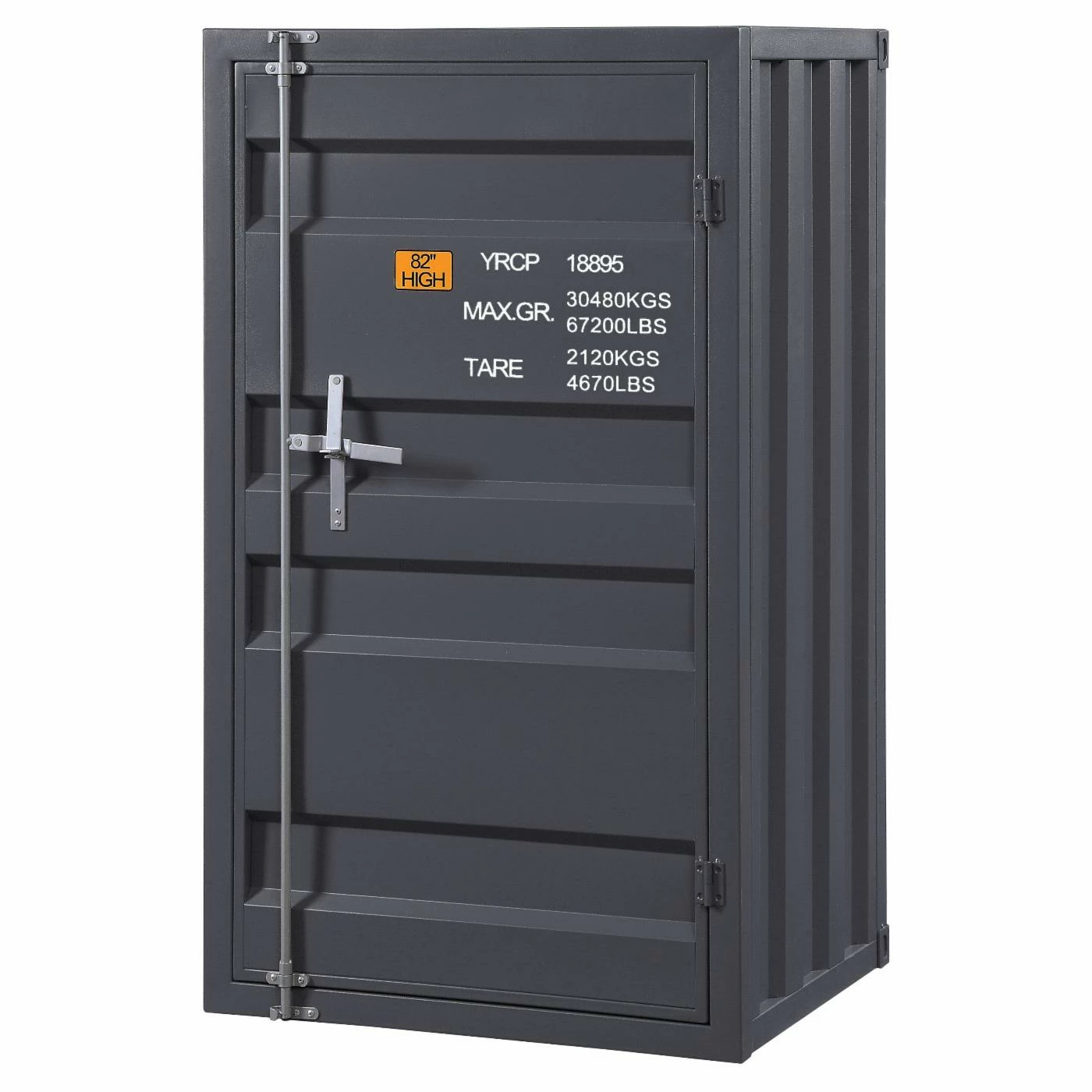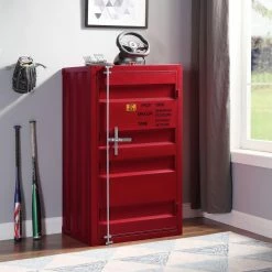 For books, toys, clothes, and anything else you can imagine, the Acme Furniture Cargo Kids Bedroom Chest with 1 Door is an exciting way to bring more storage to your kids’ or guest bedroom. This chest is rendered from durable metal with corrugated sides, adorned with decorative shipping labels, The door has metal hinges and a vertical bolt lock, opening to reveal five interior shelves. Customize the piece with your choice of available finish option.