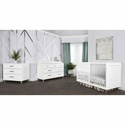All of those extra clothes you don’t have room for in your child’s nursery will have a home in the Evolur Loft Art Deco 3 Drawer Nursery Chest. The art deco design is brought to life with the crafted end panels that showcase the molding known from this style. The solid white finish allows the silver handles and round feet to stand out. The durable construction of this nursery chest arrives from the kiln-dried hardwood and veneers. Pair this chest with other items from the Evolur Loft Art Deco Collection to complete your nursery in artistic style.