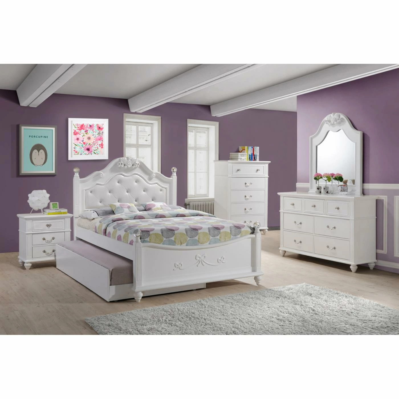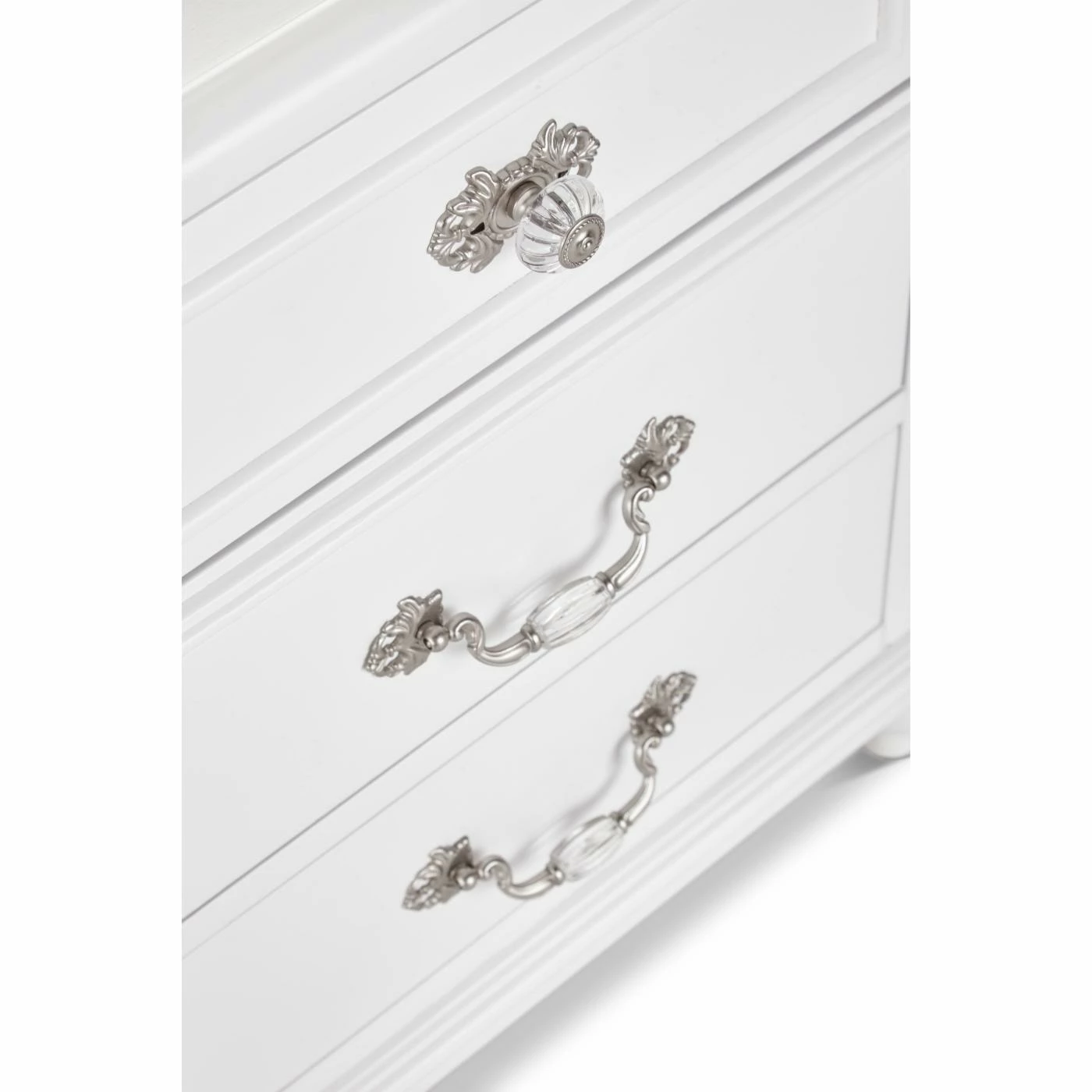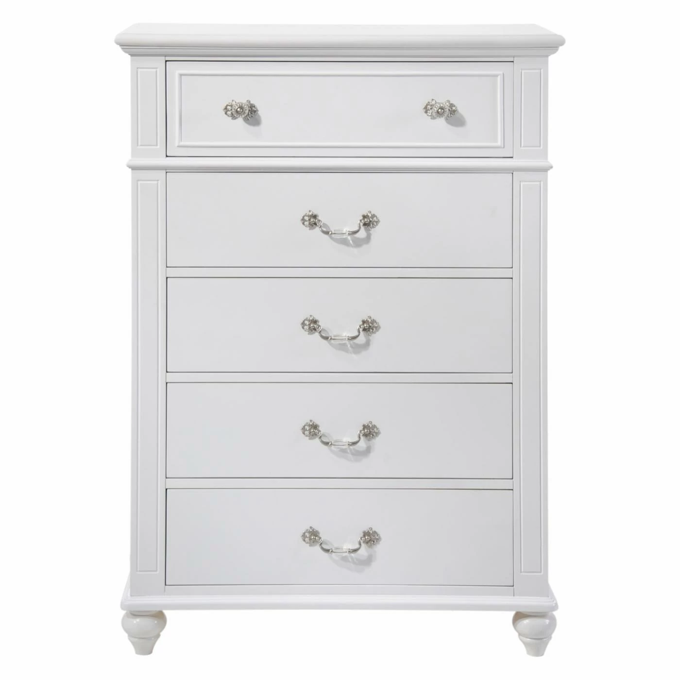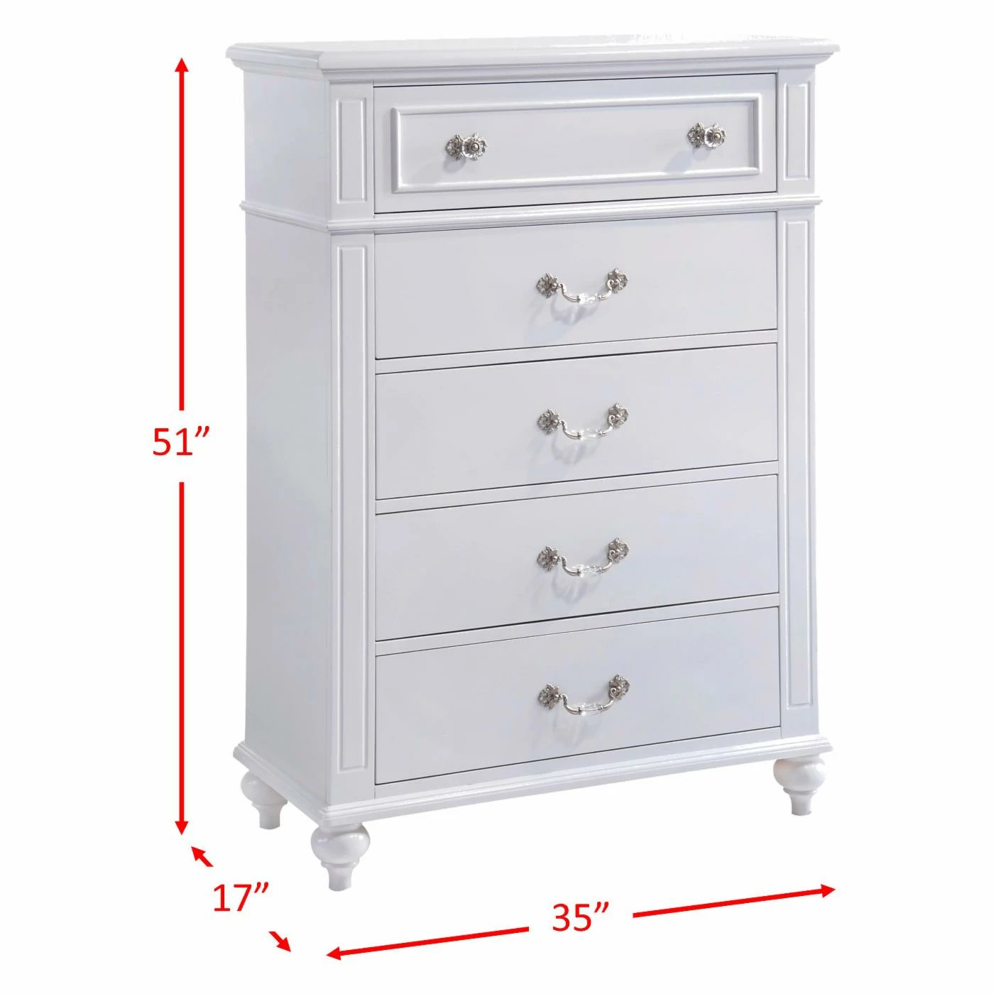 Classic details and crystal accents give the Picket House Furnishings Annie Chest an alluringly chic appeal. This bedroom storage essential is crafted of solid rubberwood and okoume veneers in a soft white finish. Its five drawers feature English dovetail construction and kenlin metal glides, while the top drawer is also lined in felt to protect delicate possessions.
