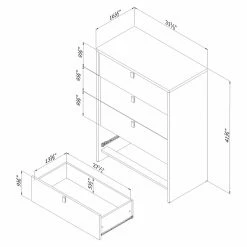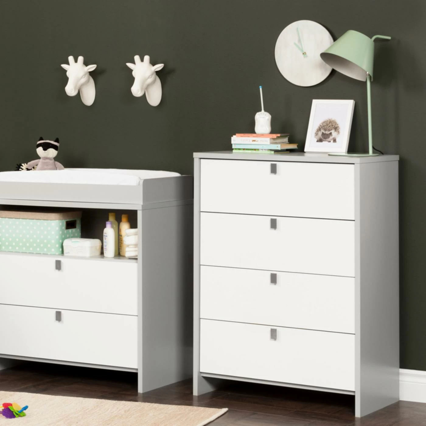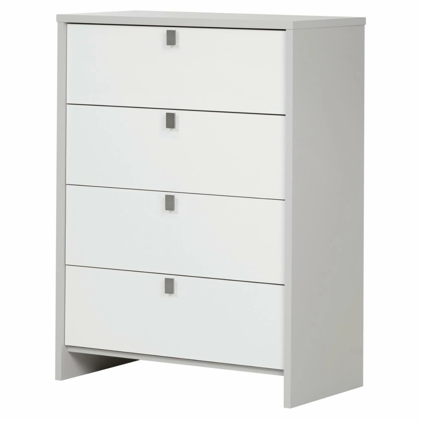 The soft gray finish on the South Shore Cookie 4 Drawer Chest pairs perfectly with its pure white drawer fronts and chromed metal handles. This chest is built in North America from non-toxic laminated engineered wood. It features four roomy drawers with metal slides.
