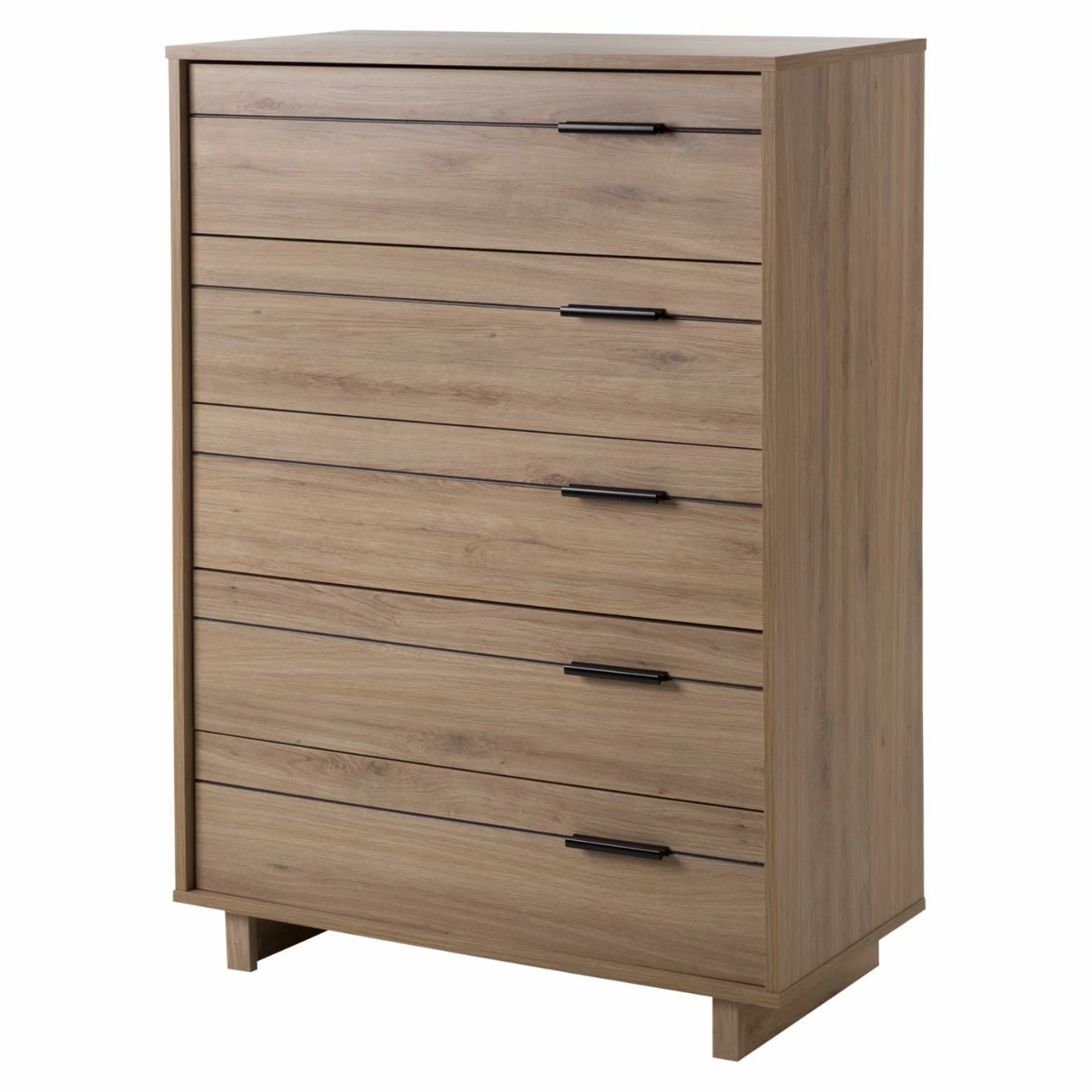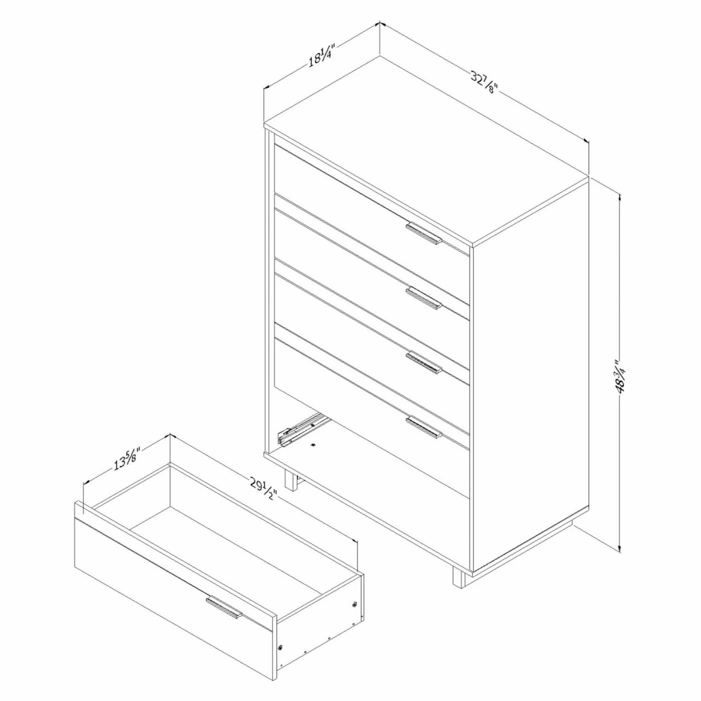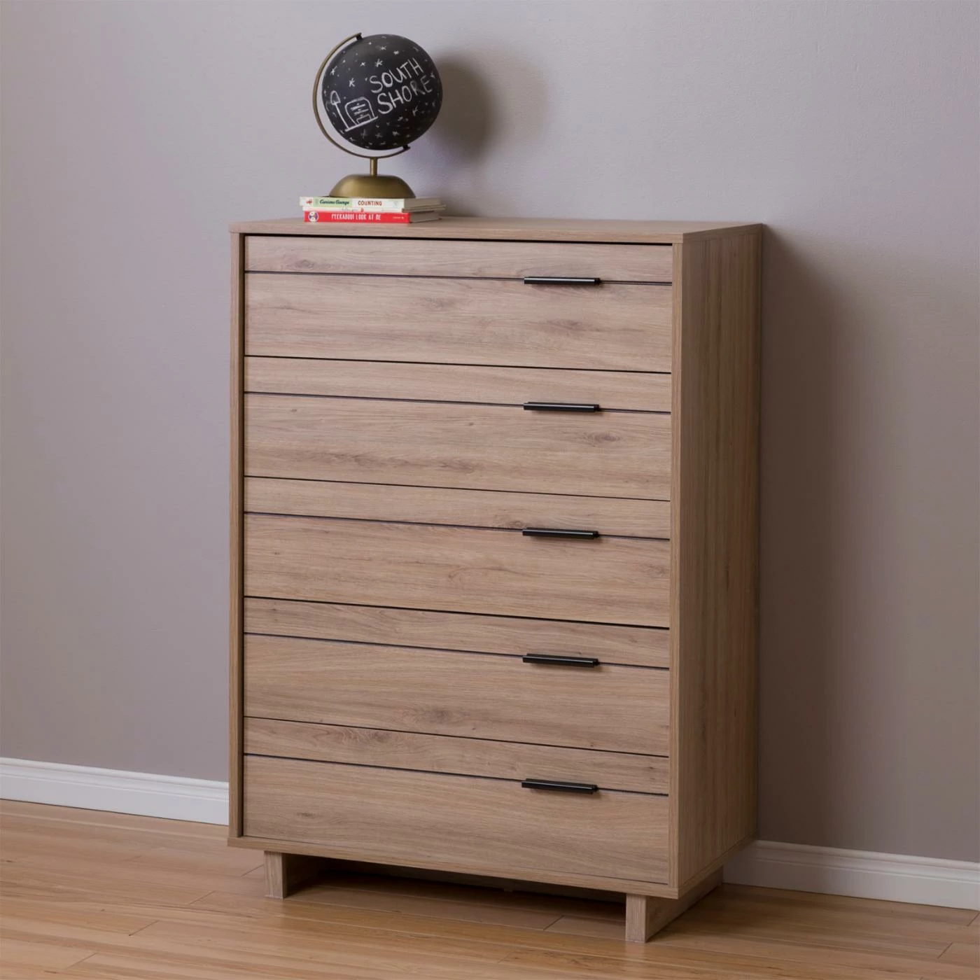 Keep clothing and accessories stored while using less floor space with the South Shore Fynn 5 Drawer Chest. Its vertical design includes five smooth-gliding drawers stacked one above the other for a compact footprint. Finished in your choice of select colors, the chest reflects modern design trends and is adorned with sleek, dark black metal bar handles. The dresser is supported by two rectangular legs and is free of sharp corners to ensure your child’s safety.