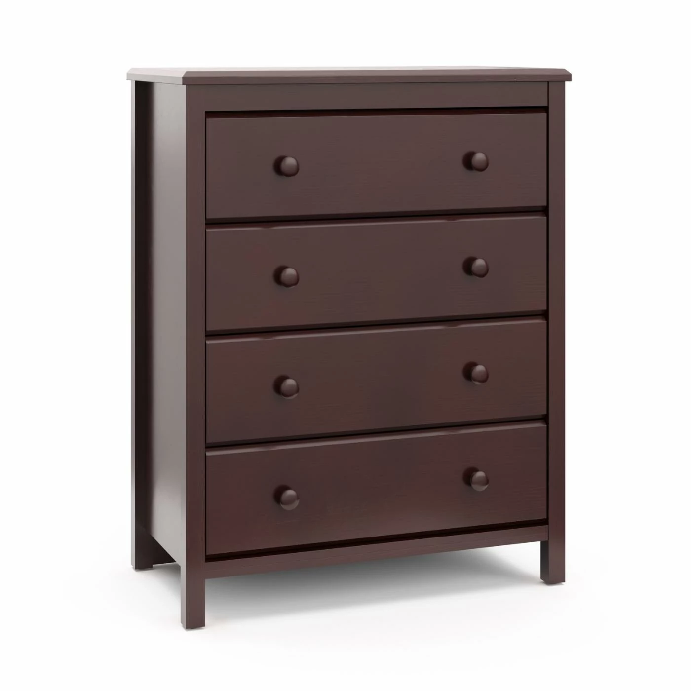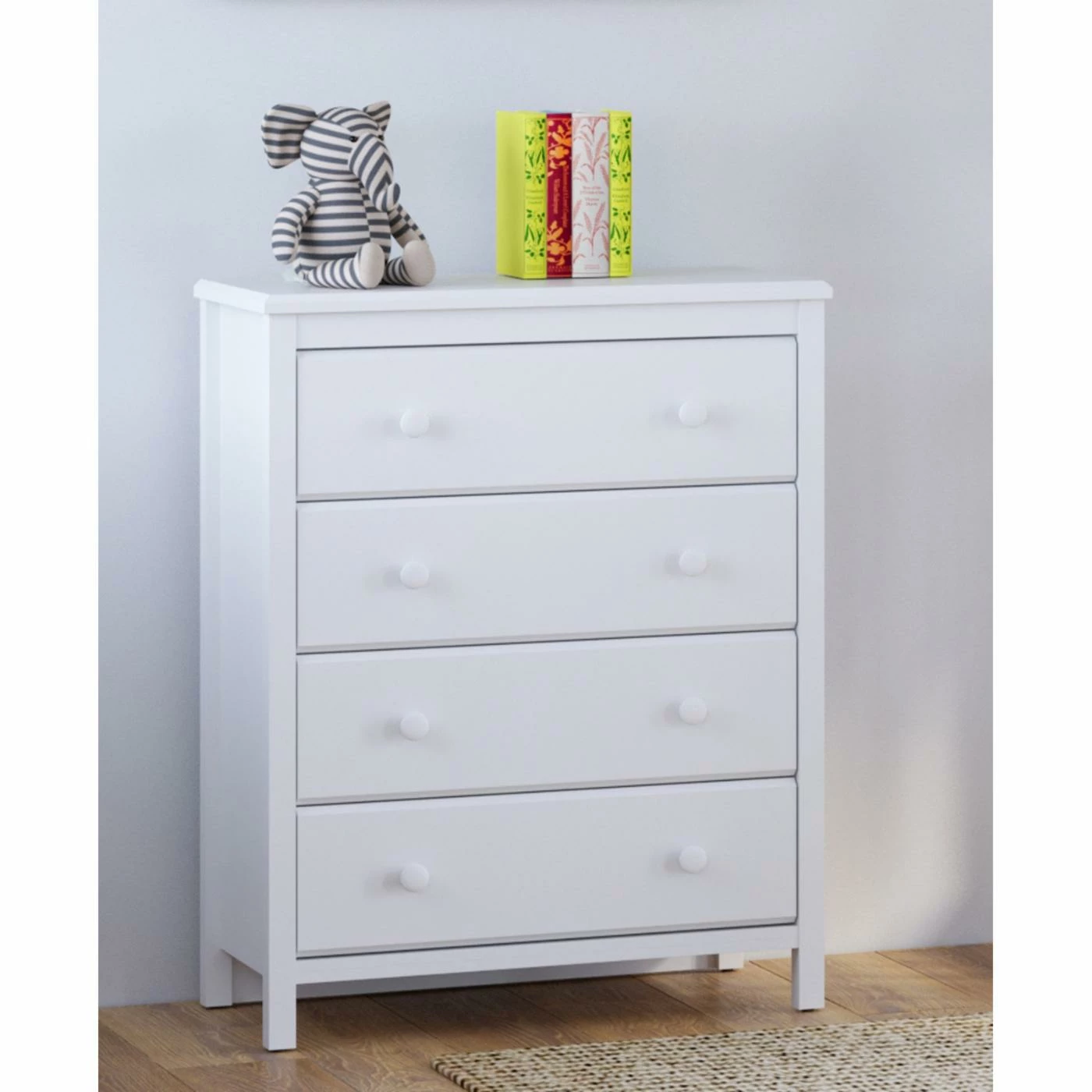The Storkcraft Alpine 4 Drawer Chest is the super-safe space-saving solution you’ve been searching for. Crafted from sturdy wood materials in your choice of available non-toxic finishes, this vertical chest meets all ASTM and CPSC safety standards and has an anti-tipping design. The four roomy drawers include two round knobs each for easy opening. A smooth top surface provides the perfect spot for displaying your child’s toys, books, or other items. Neutral hues and a crisp design makes this dresser easy to match to your current home dΓ©cor.
