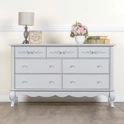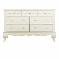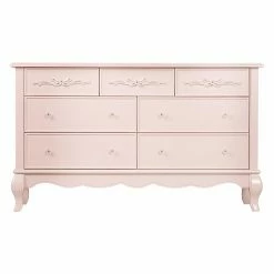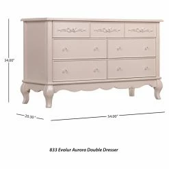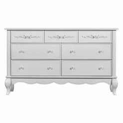 You don’t need a magic wand to enchant your child’s room with a fairytale ambiance. The gracefully designed Evolur Aurora 7 Drawer Double Dresser makes for a wonderfully charming nursery with ample function to make changings easy. The Victorian style double dresser incorporates soft, feminine carvings, crystal knobs, and Queen Anne style feet. All drawers boast adult-size dimensions so that they can be used for diapers and toys now, and sweaters and slacks later in life. There are seven drawers in total, each with three-tier glides for long-lasting durability and smooth operation. For the finishing touch, the top three drawers are carved with delicate ribbon and bow scrollwork. Choose from multiple available color options to make it yours.