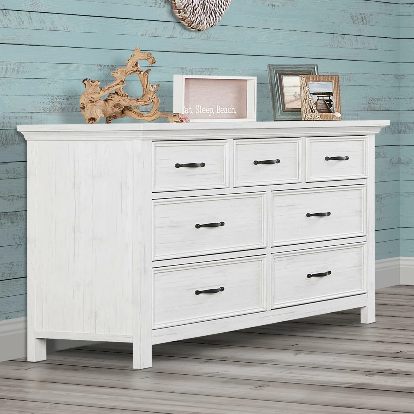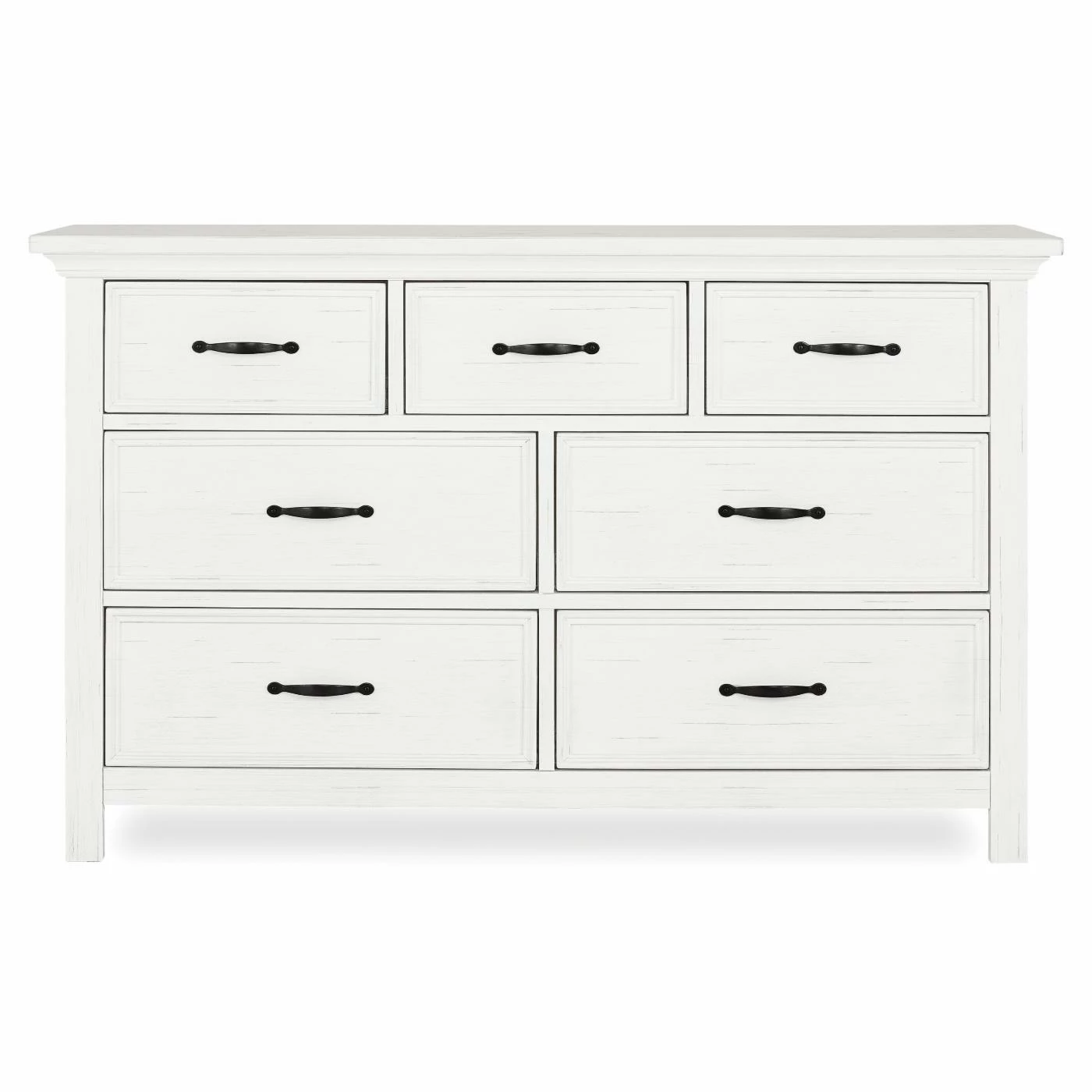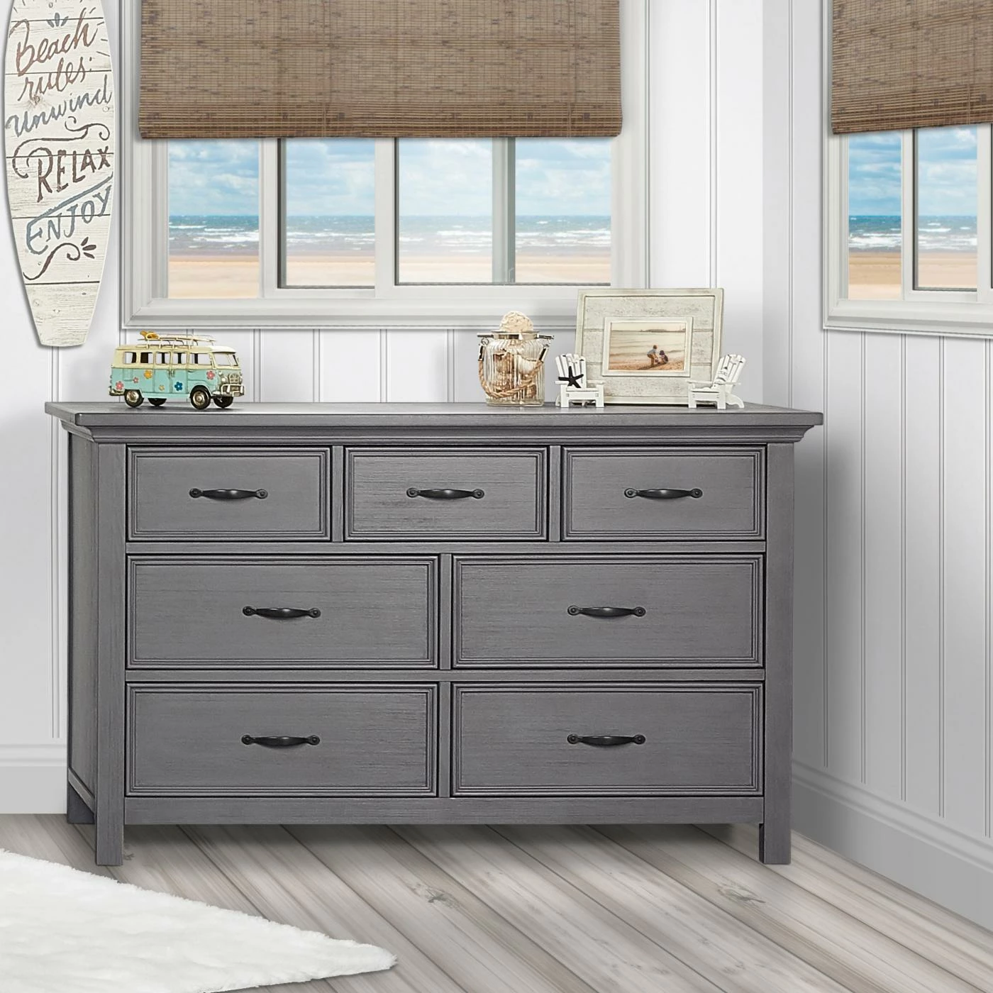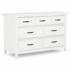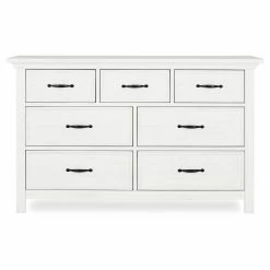 With a clean-lined simplicity that’s sure to be a favorite well into their teen years, the Evolur Belmar Double Dresser will be the perfect addition to your little one’s nursery. Safety features abound, including an anti-tip kit and rigorous testing for lead and other toxic elements to meet or exceed ASTM safety standards. The seven drawers are built to last, too, offering antique brass pulls, side-mounted three tier glides, independent drawer box construction, and English dovetail joinery. The dresser is crafted of kiln-dried hardwood with hardwood veneers, and it’s available in a choice of finish. Add your own contour changing pad to the top for an convenient changing surface.