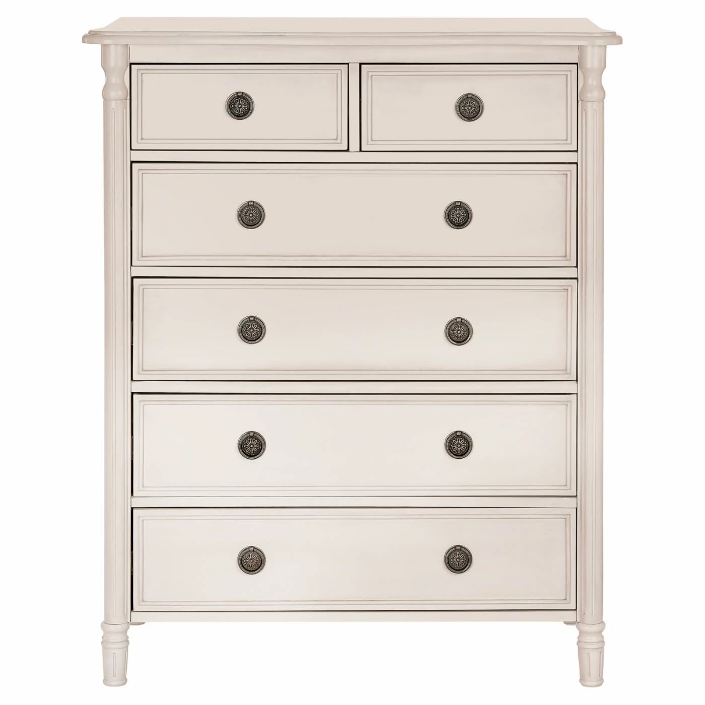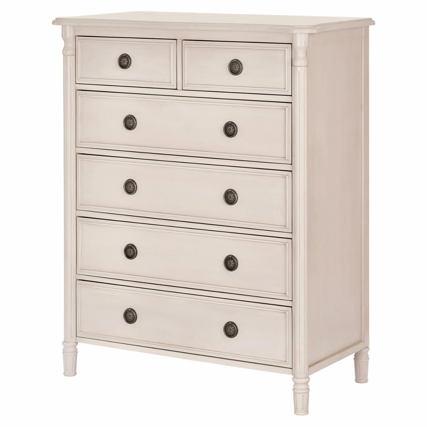 The elegant Evolur Julienne 6 Drawer Dresser is crafted from kiln-dried hardwood and fine veneers in your choice of available finish. It features fluted, hand-turned posts framing two decorative top drawers and four large, full-width drawers perfect for bringing function to a nursery or bedroom. Each drawer is adorned with antique cast pewter metal pulls and heavy-duty, side-mounted extension glides for easy access and smooth operation. A matching crib, dresser, and bookcase are also available right here at Hayneedle.com so you can fully furnish your child’s space in style.
