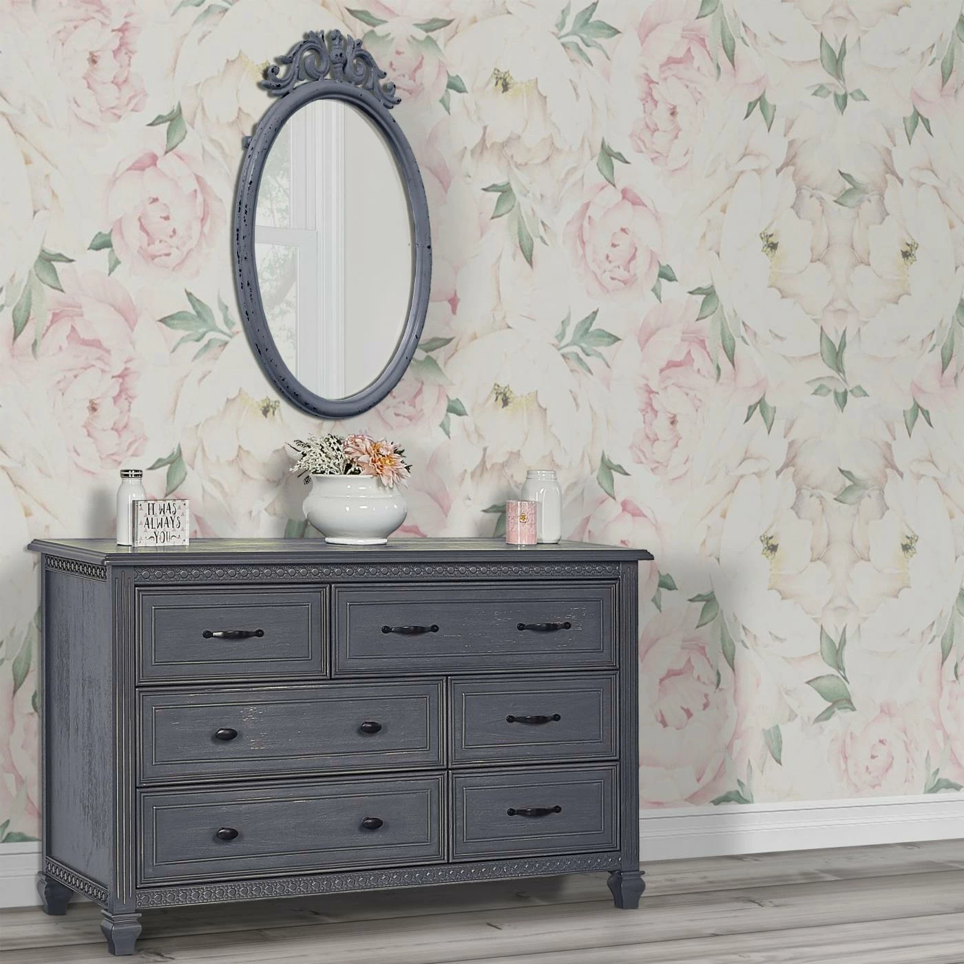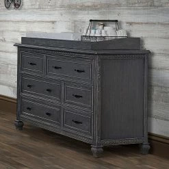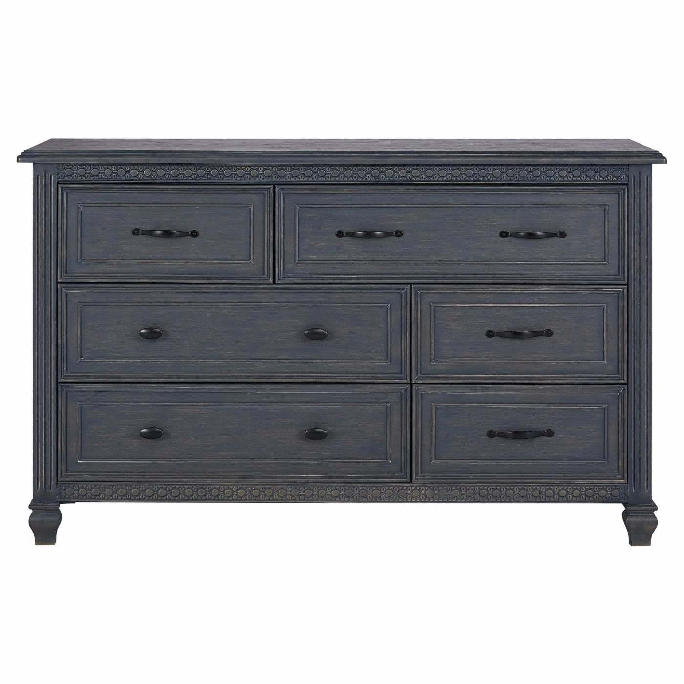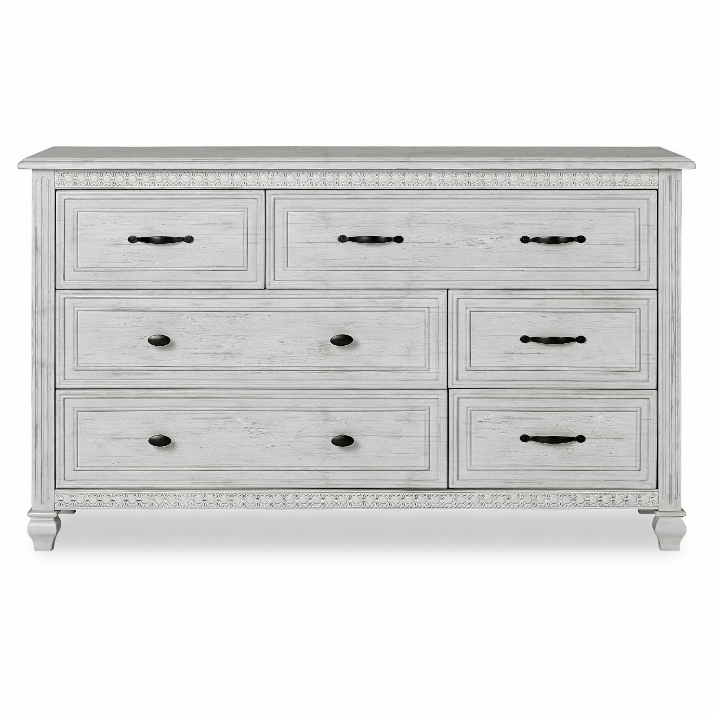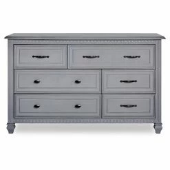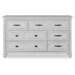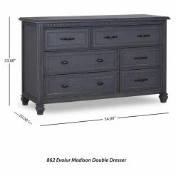 You donโt have to sacrifice space for beauty with the Evolur Madison Double Dresser in your childโs room. This double dresser with fluted legs is crafted from hardwood with fine veneers and features an art deco inlay trim and molding. Each of the six drawers with arched pulls uses dovetail joints and five-piece box construction. They open and close on side-mounted three-tier drawer glides. This double dresser meets or exceeds ASTM safety standards and includes an anti-tip kit to help keep your child safe. Choose from the available finish options. No assembly is required.