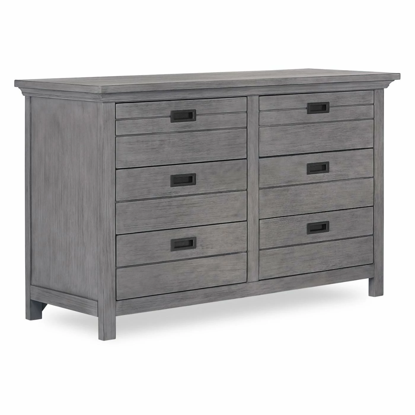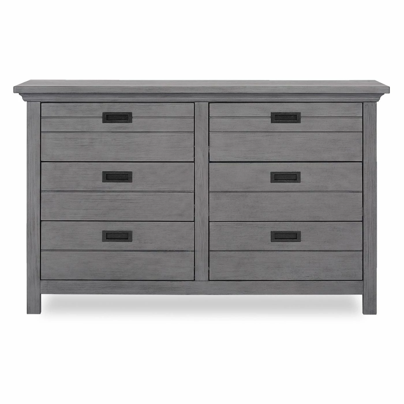 The rustic non-toxic finish, lodge panel front, and black metal drawer pulls complete the design of the Evolur Waverly Double Dresser. This dresser is constructed from wood and features English dovetail joints. The six drawers have side-mounted, three-tier full extension glides and will provide plenty of space for you to store all of your child’s clothes. This dresser coordinates with the Evolur Waverly collection.