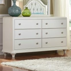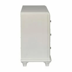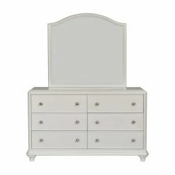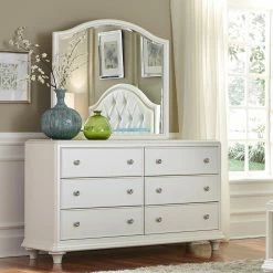 For abundant storage and display space, too, the Liberty Furniture Industries Stardust Youth 6 Drawer Dresser with Optional Mirror – Iridescent White offers six side-by-side drawers. The drawers are roomy and the top ones are lined in black felt. For chic elegance, this dresser is graced by an iridescent white finish and faceted crystal knobs. Make it complete by adding the optional, matching mirror, which attaches securely to the back of the dresser.