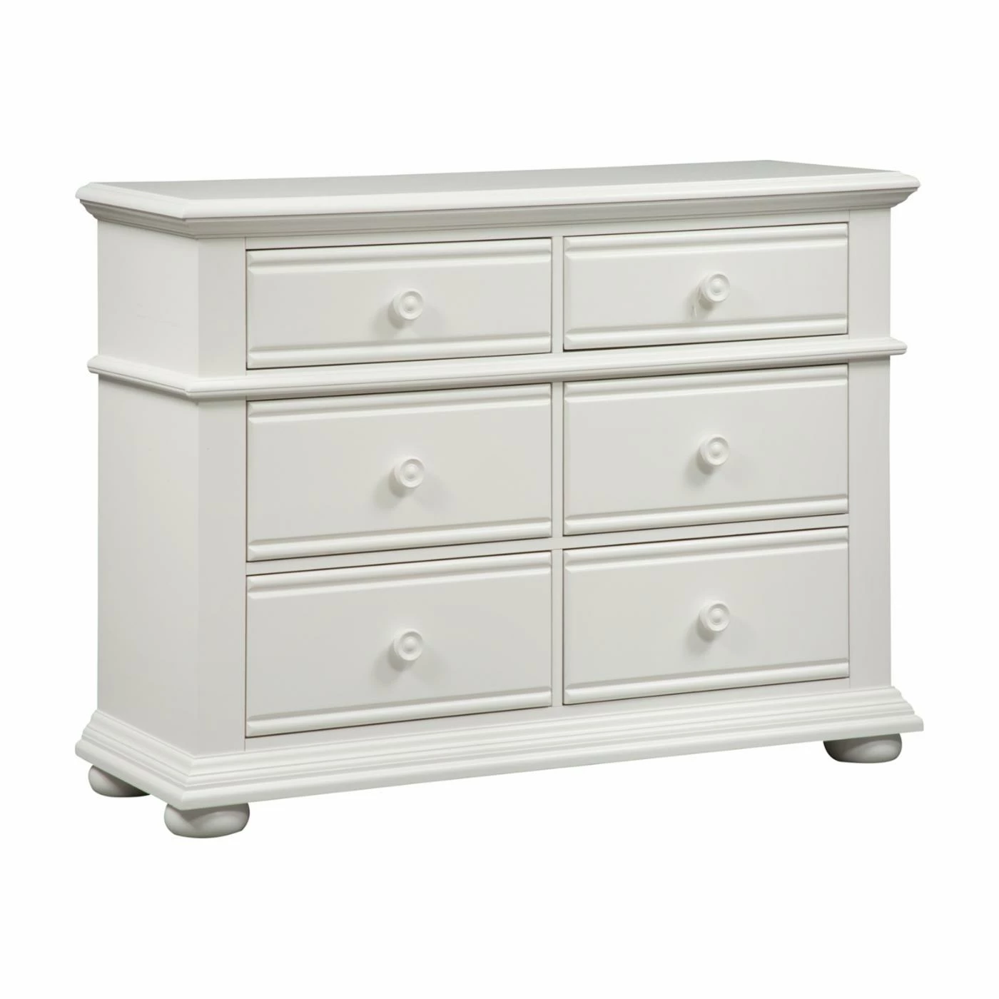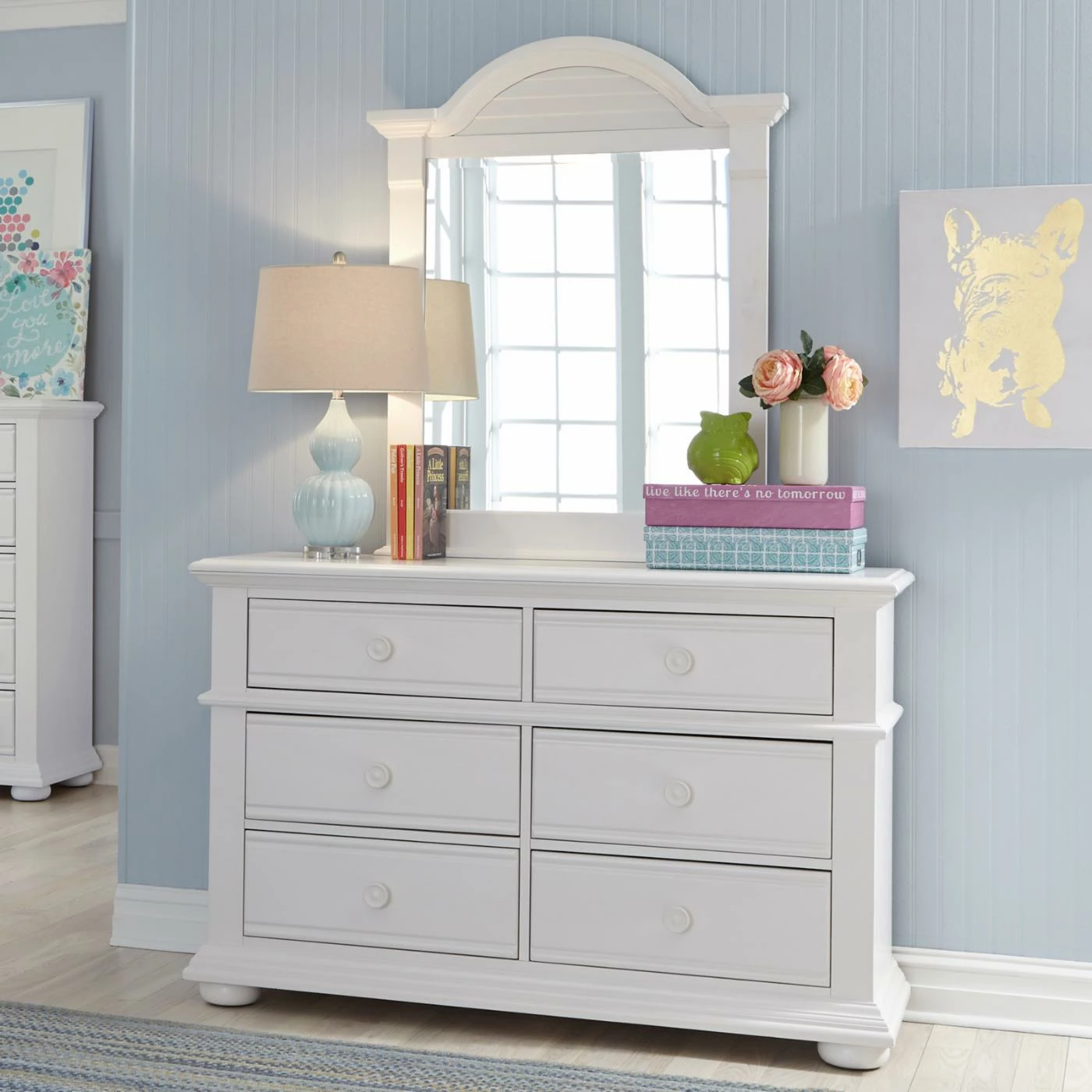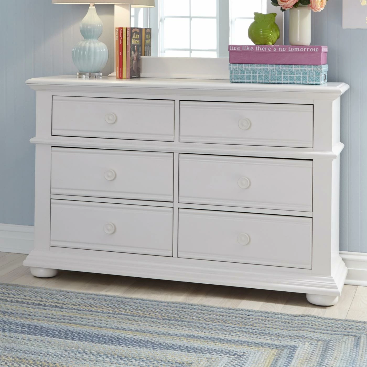Six side-by-side drawers in the Liberty Furniture Industries Summer House Youth 6 Drawer Dresser with Optional Mirror – Oyster White ensure abundant storage space. This dresser also offers a roomy top for display pieces. Cottage charm comes from its bead board drawer fronts, bun feet, and oyster white finish. Complete the look of this dresser by adding the optional, matching mirror. It attaches securely to the back.