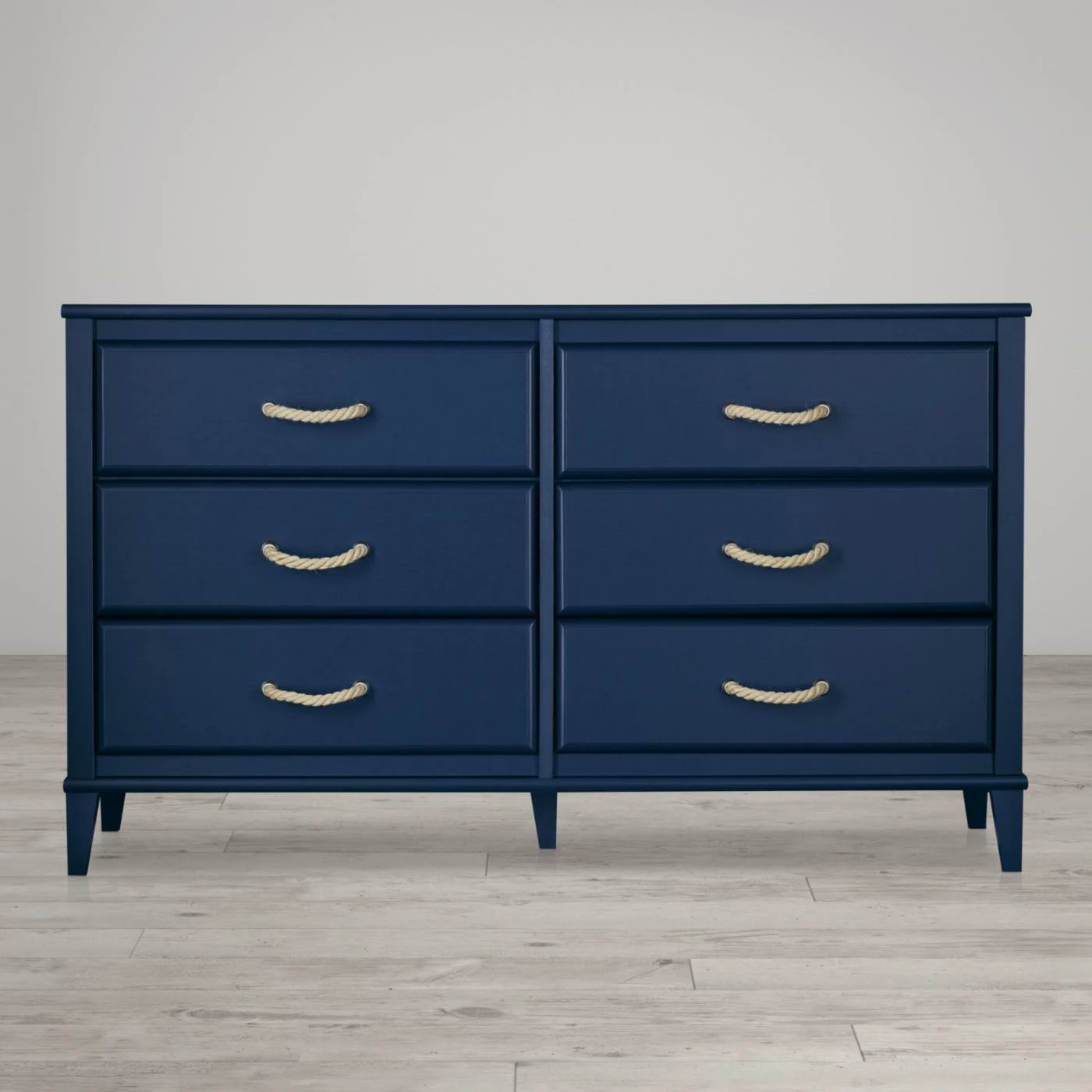 Store your kid’s clothes in classic style with the wooden Little Seeds Sierra Ridge Mesa 6 Drawer Dresser – Blue. Each drawer is mounted on metal slides with built-in stops and easily opens with its rope handles. For safety, this children’s dresser comes finished in non-toxic blue paint and is balanced on five feet. Use the included wall anchors to enhance this piece’s stability.