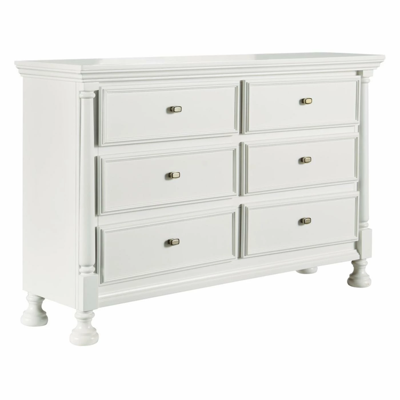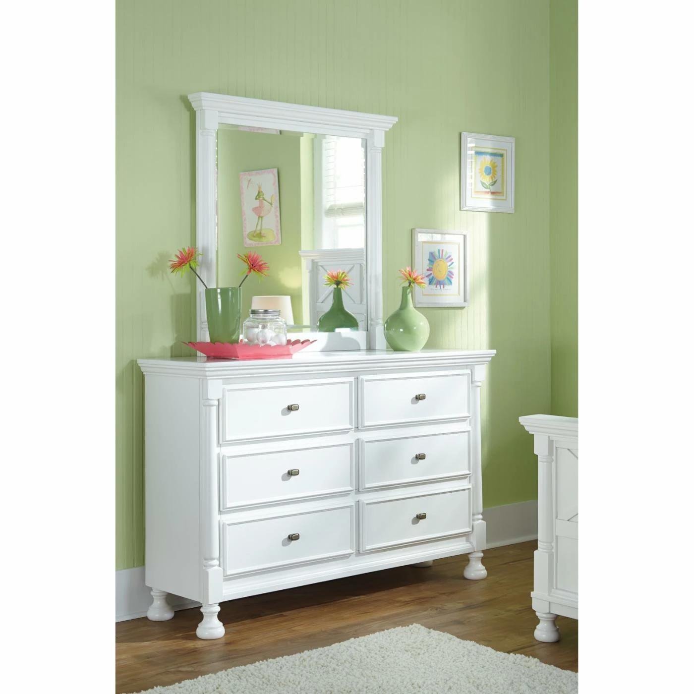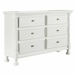 Set this Signature Design by Ashley Kaslyn 6 Drawer Dresser with Mirror in your bedroom to store loads of clothing, bedding, and other items. This dresser is swathed in a crisp white finish and equipped with six spacious drawers. The half round pilasters are set on turned bun feet for a decidedly elegant look. Make this dresser complete by adding on the optional, matching mirror.