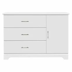 TheStorkcraft Brookside 3 Drawer Combo Dresser includes everything you need for basic nursery storage. This dresser is constructed of engineered wood for durability and finished in color options to best coordinate with existing dΓ©cor or other Storkcraft pieces. The finish resists spills and dirt for easy maintenance. Three spacious drawers and a two-shelf cabinet are accented with silver bar pulls. For safety, the dresser meets anti-tipping standards, in addition to other safety certifications.