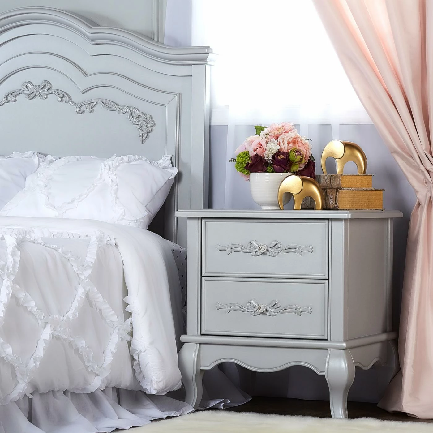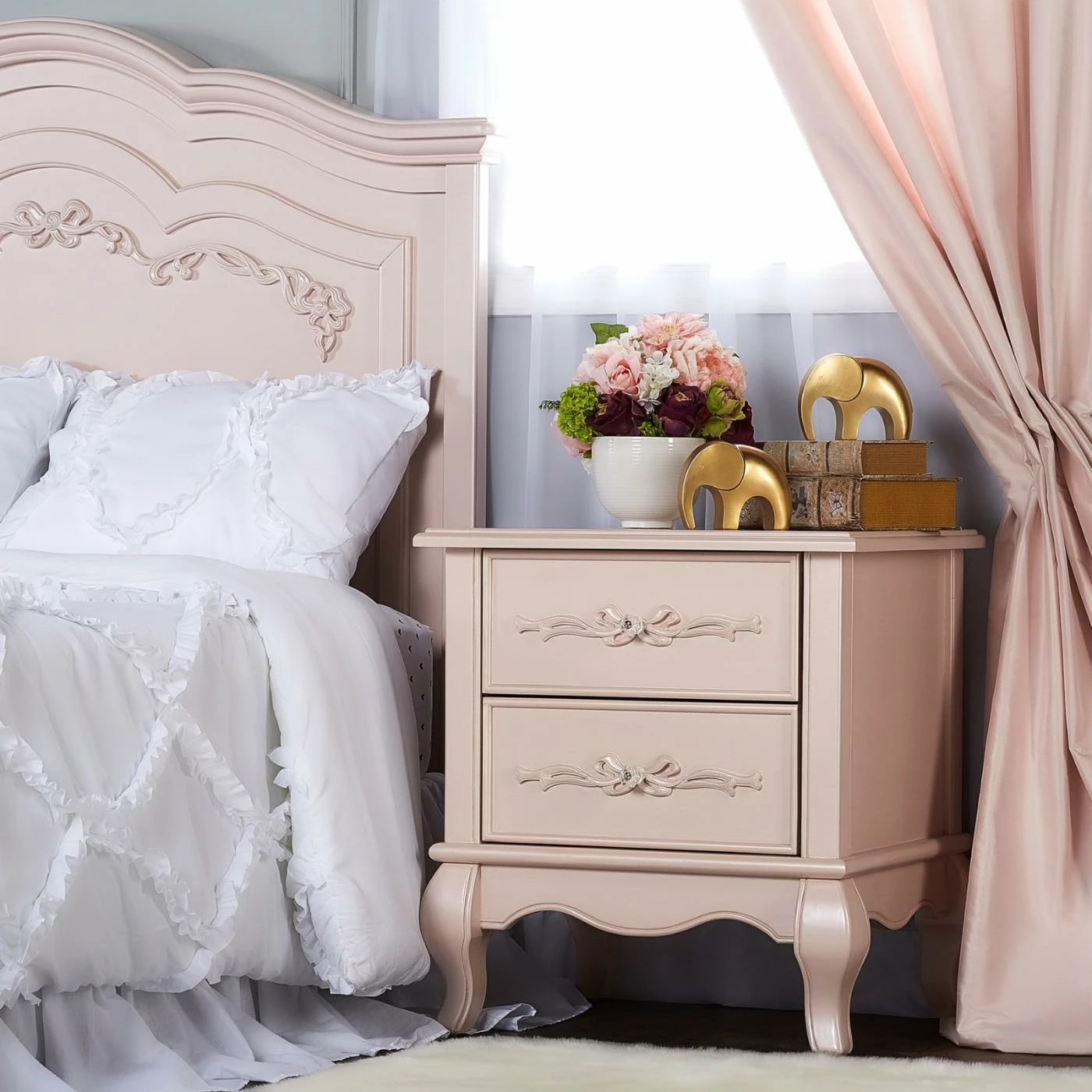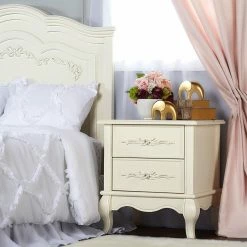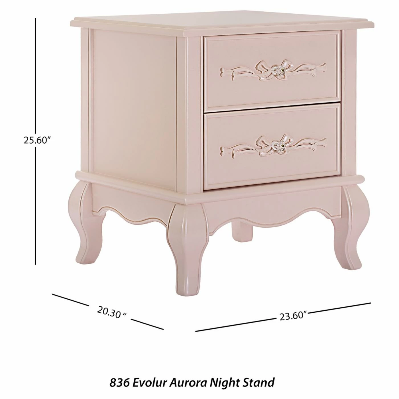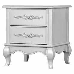 The Evolur Aurora 2 Drawer Nightstand can be used in any room of the home. Your little girl will see her new nightstand as something right out of the pages of her favorite fairytale, but in the living room, guests will see a Victorian style accent table with Queen Anne feet and feminine carvings. Its spacious top is great for adding a lamp or displaying framed photos, and each of its two drawers are carved with intricate ribbon and bow scrollwork. Choose from multiple available finish options.