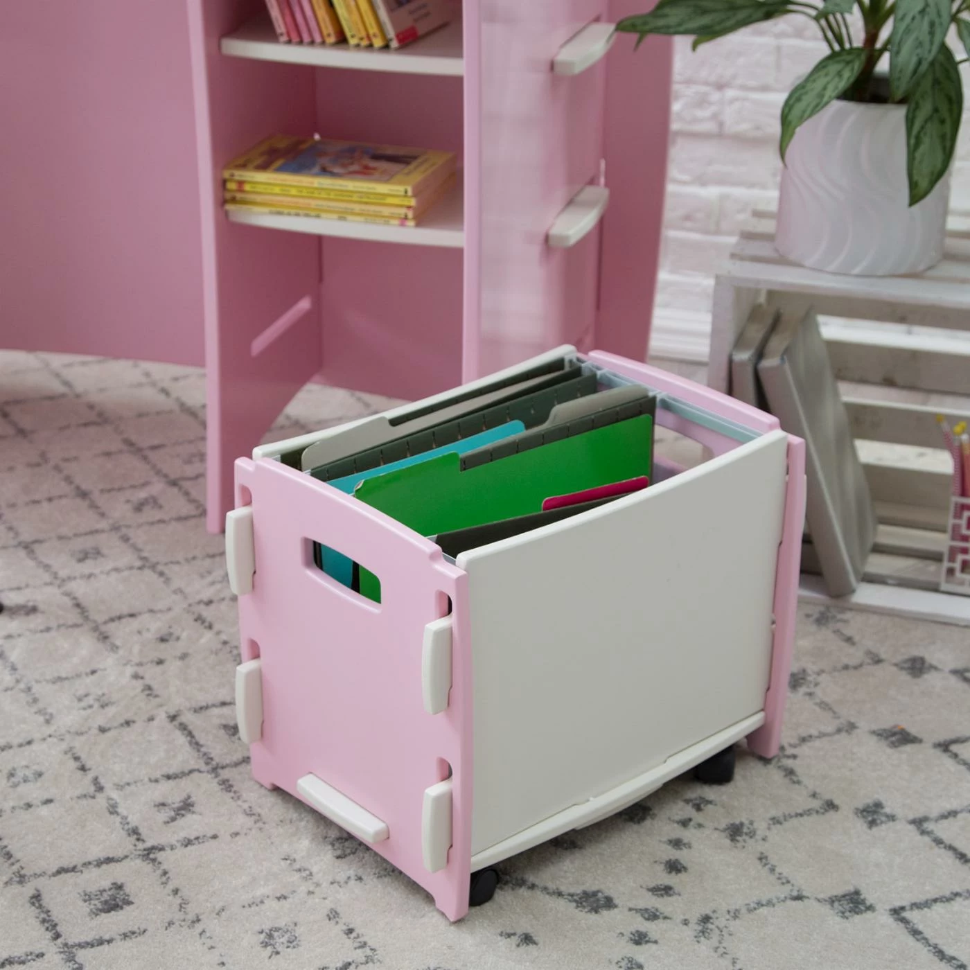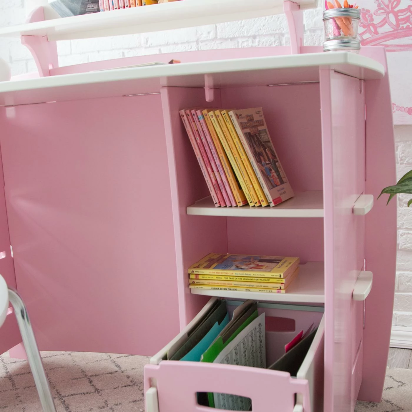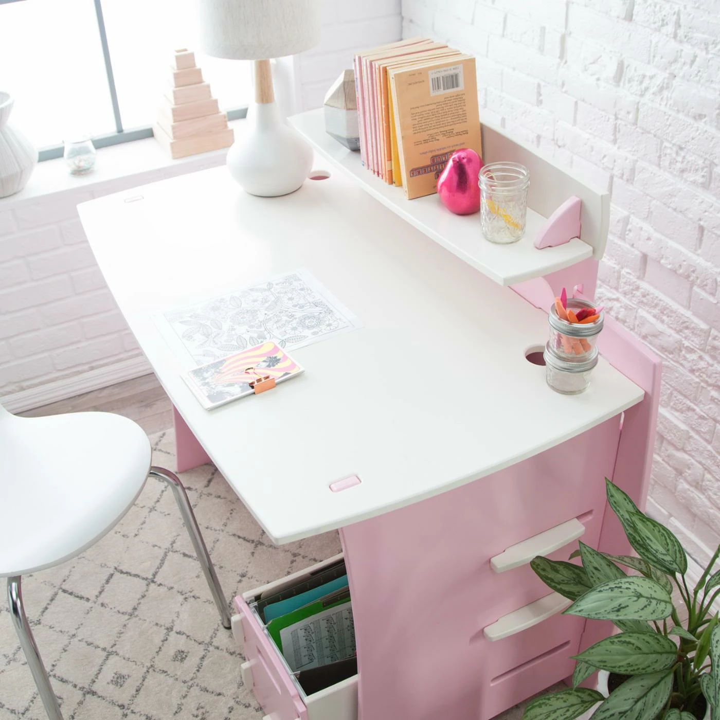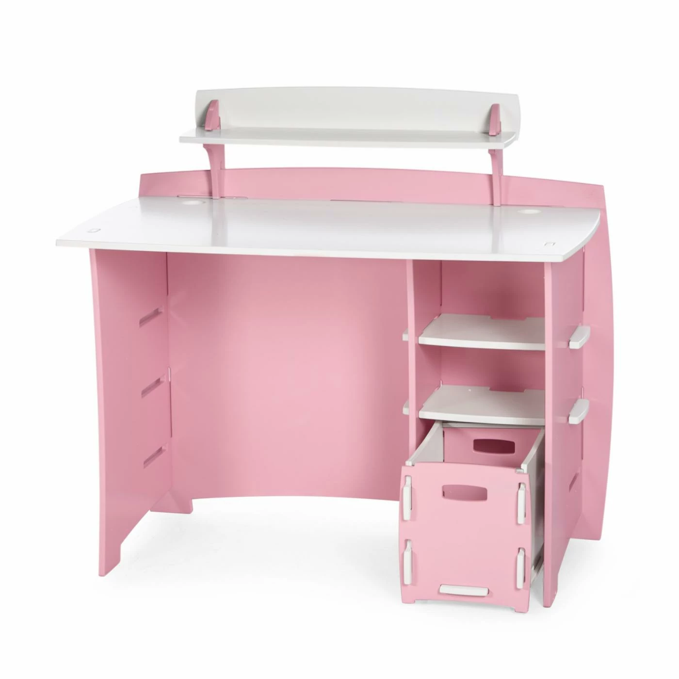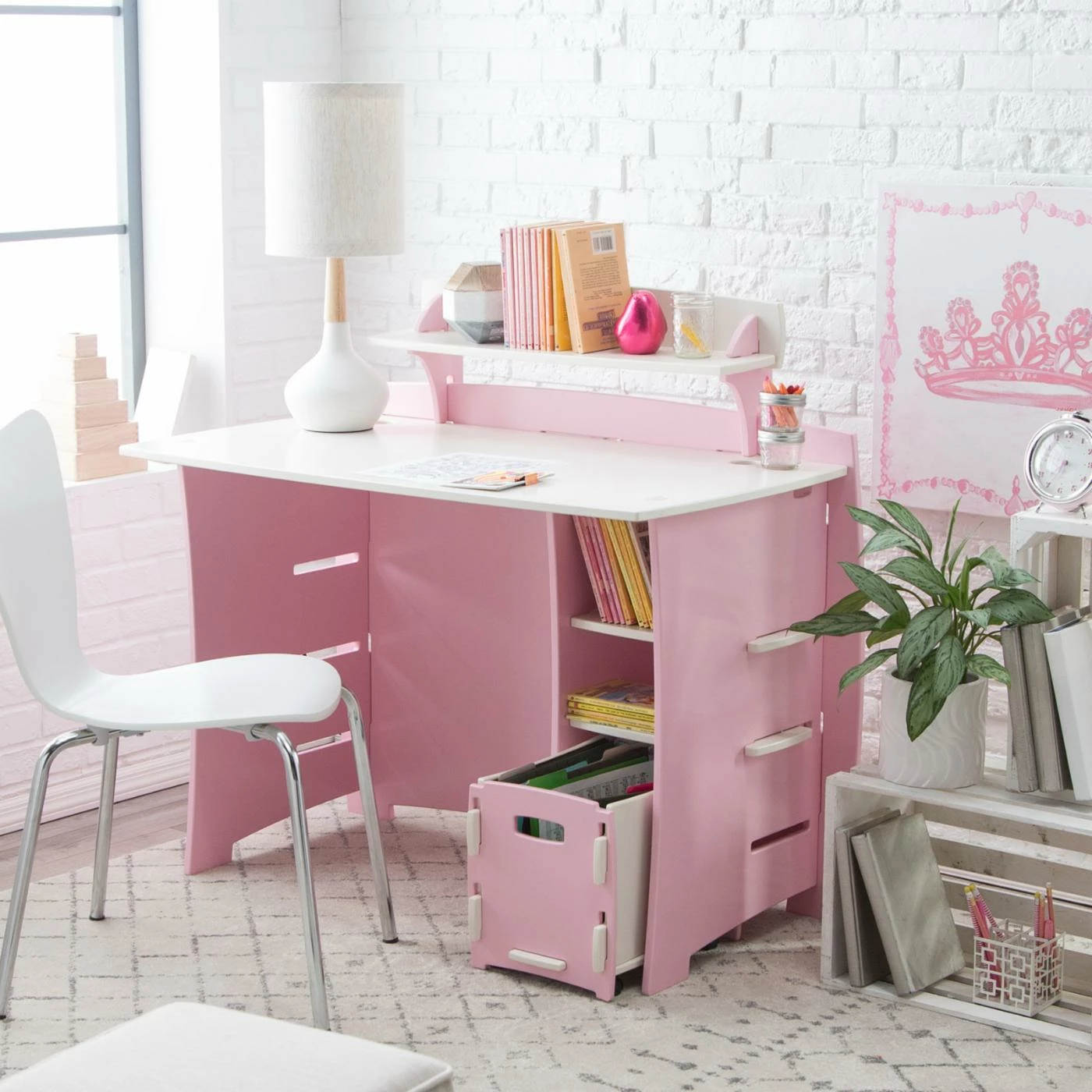 It doesnโt matter if the shelves are filled with crayons or textbooks, the Legare 43 in. Desk with Shelf and File Cart – Pink and White is going to be a staple in her room. Crafted from durable sheets of medium-density fiberboard, this adorable desk assembles in fewer than 10 minutes, no tools required. The soft matte finish of pink and white is easy to clean, and the rounded edges make it safe for little kids and stylish for the bigger ones. Two lower shelves add more storage, and below them is a convenient rolling file cart. A shelf above the desktop is perfect for phones, tablets, and PDAs. This desk can be configured to accommodate left- or right-handed kids.