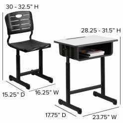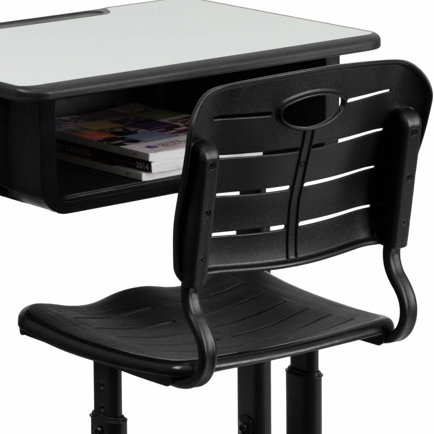 Furnish your classroom for success with the Flash Furniture Adjustable Student Desk and Chair with Black Pedestal Frame. The desk’s high pressure laminate top is 0.75 inches thick and features a handy pencil groove. Raising the desk and chair by up to three inches is as simple as 1, 2, 3, allowing this set to work for students from elementary through high school. The under-desk compartment allows space for books, papers, and supplies. The desk also has a hook on each side so students can keep their jackets and backpacks close at hand. The chair’s unique pedestal frame is highly stable and allows for height adjustment. The slatted seat and backrest allow airflow to keep students cooler. Anti-slip floor caps reduce noise and prevent the desk from sliding.