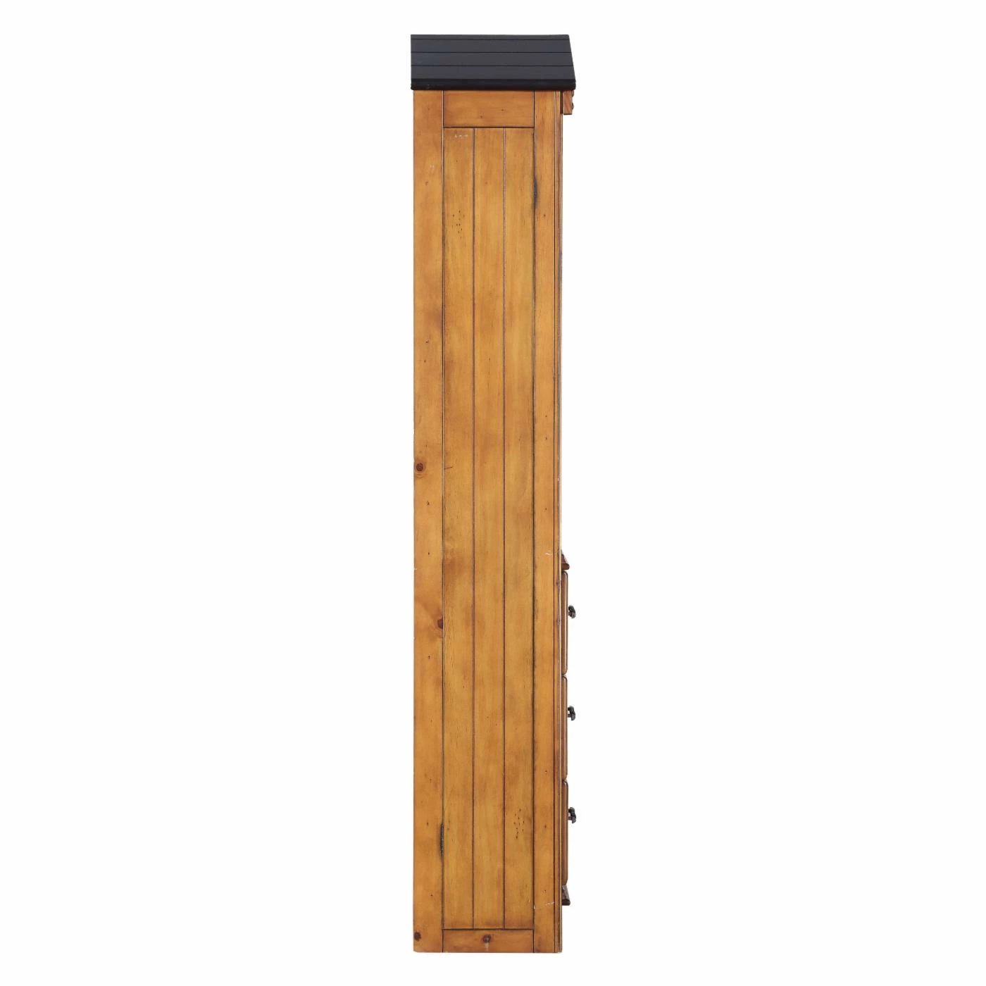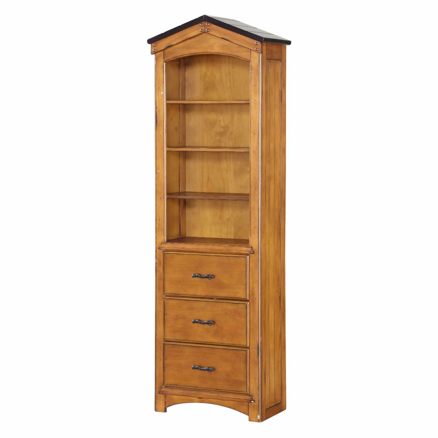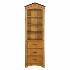 A roof, plank style sides, and branch handles make the Acme Furniture Tree House Bookcase look like it belongs in a treehouse. This tall bookcase doesn’t take up much floor space yet it offers four spacious shelves for books and collectibles, plus three roomy drawers to help keep things tidy. The bookcase is built of wood and veneers in an oak finish with dark oak roof.