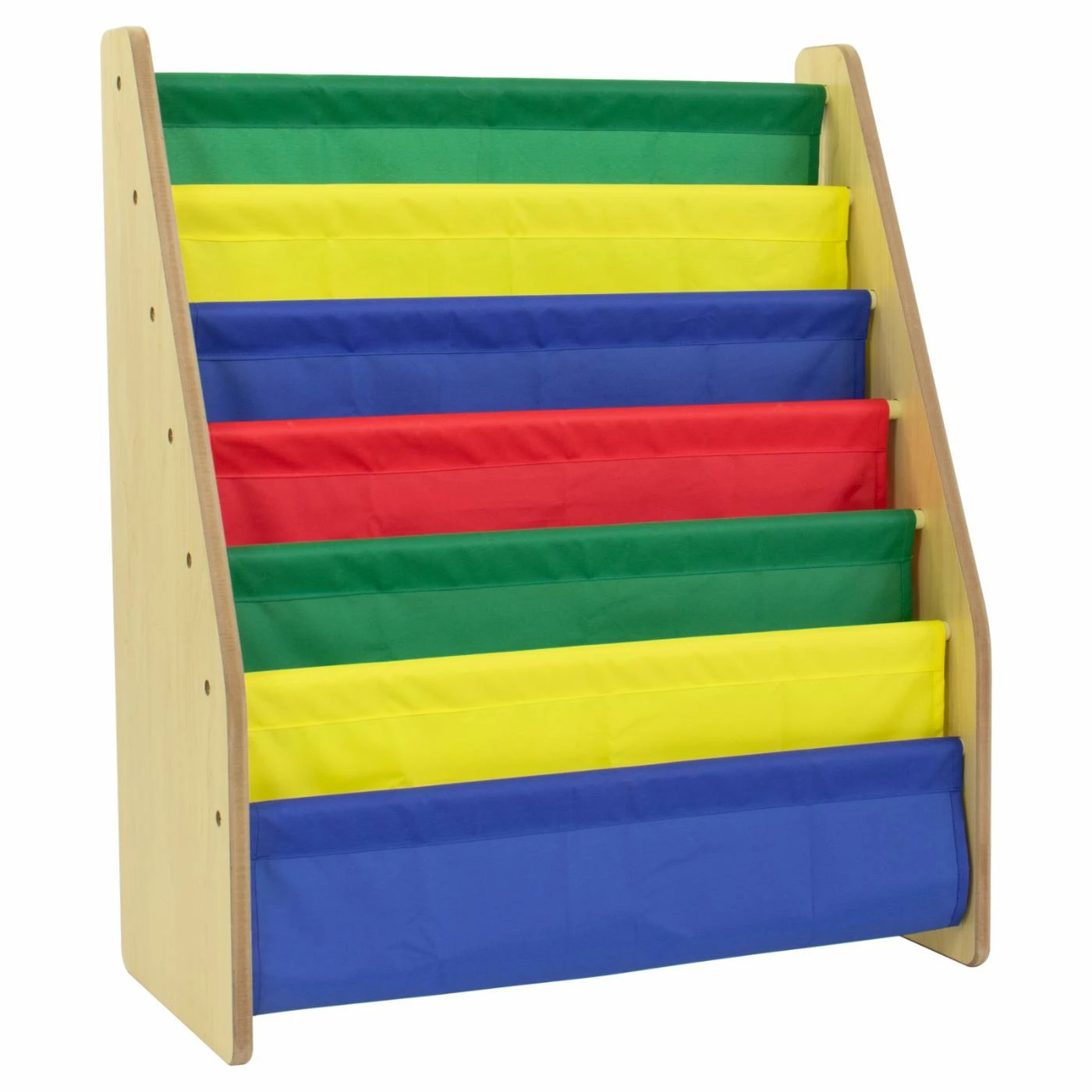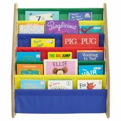 - 6 deep fabric book storage pockets in playful colors