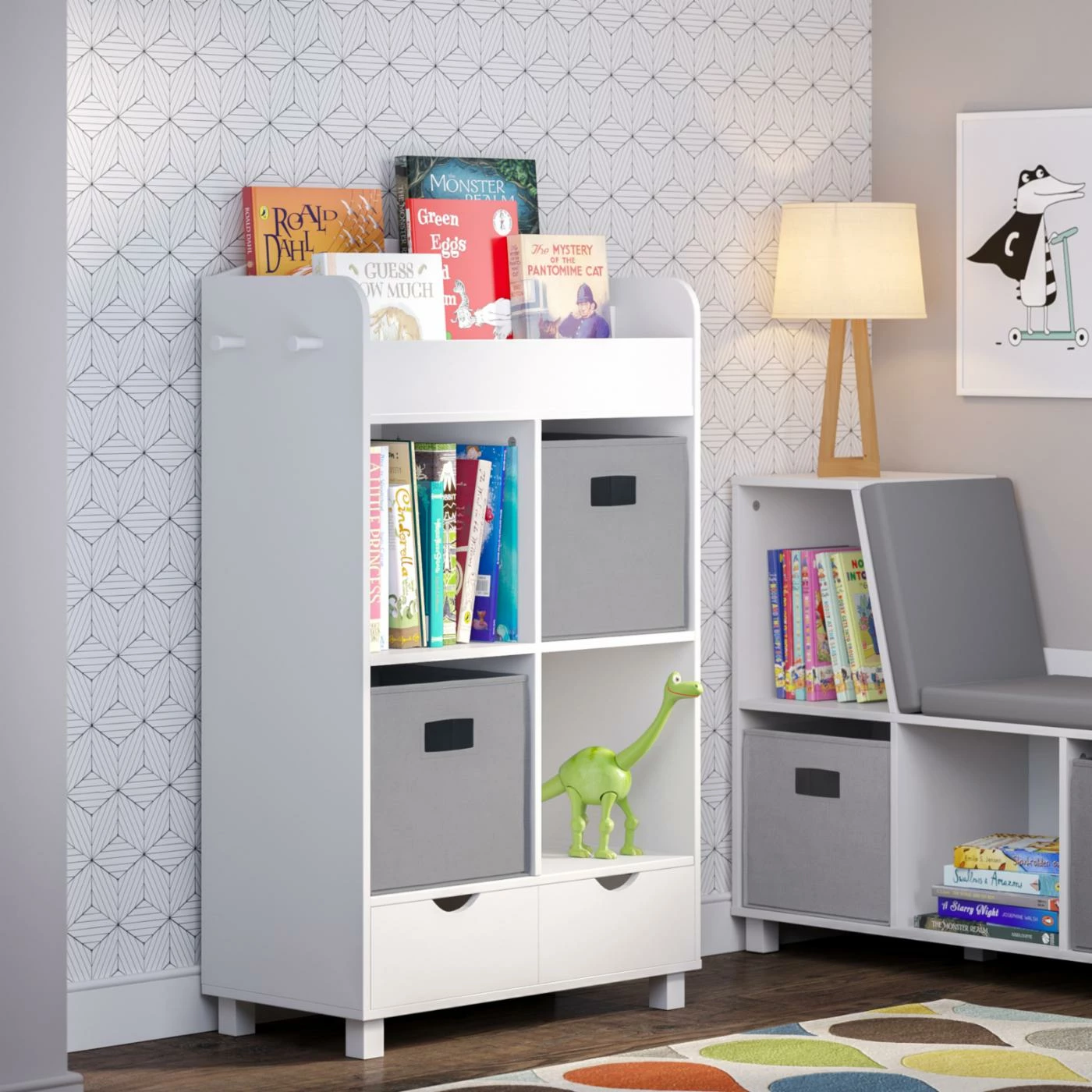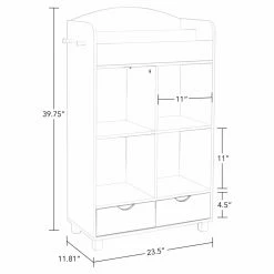 Outfitted with four spacious compartments, the RiverRidge Home Book Nook Kids Cubby Cabinet Bookcase offers storage for your youngster’s essentials. This bookcase is topped by a shelf that offers organization and display for multiple books. A pair of drawers at the bottom of this bookcase provides additional storage, giving your child space to store coloring books, crayons, and more. Add on optional removable bins for extra storage space.