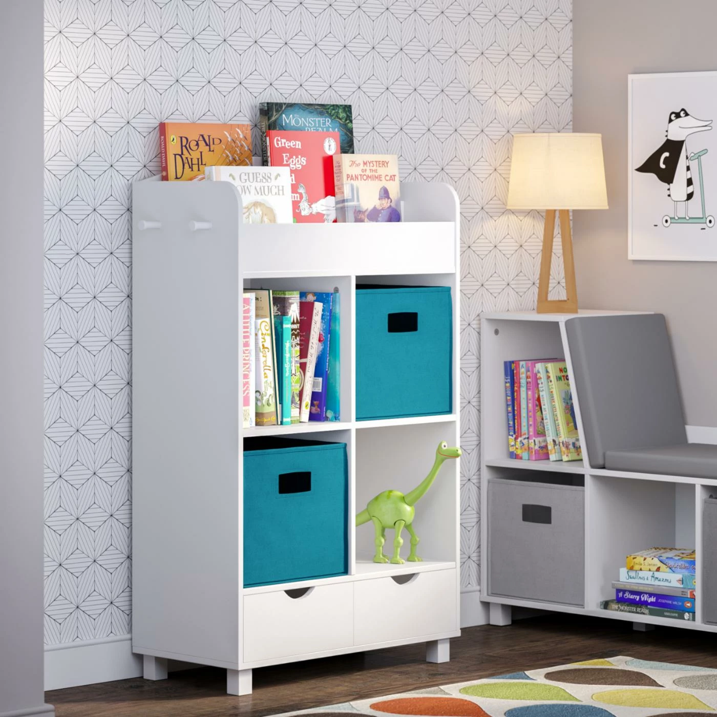 - 4 cubbies, 2 drawers, book storage