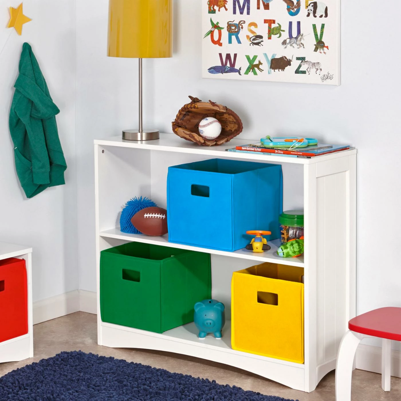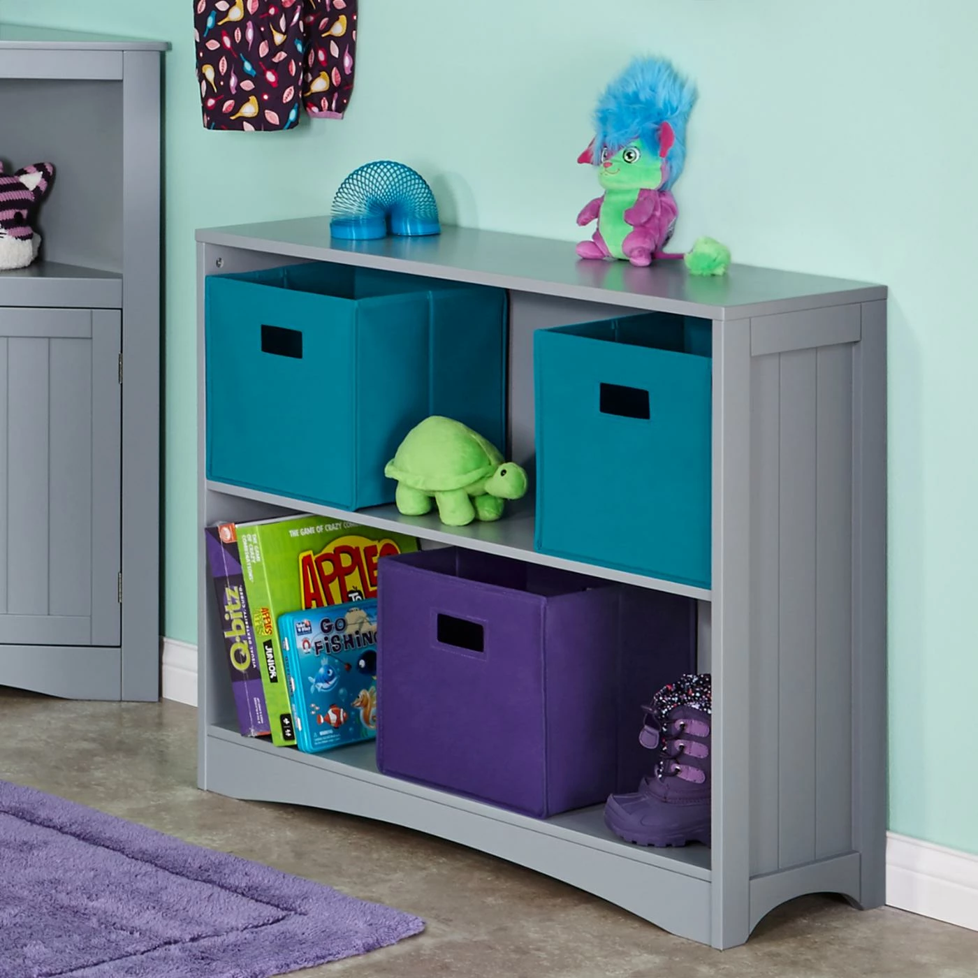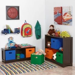 The RiverRidge Home Horizontal Bookcase with two large open shelves and top shelf is an easy way to add storage and display space to kids’ bedrooms or playrooms, while also great for other rooms in the house, such as the family room, entryway or bathroom. This bookcase features classic beadboard panels on the sides, and can accommodate up to three bins on each shelf (sold separately).