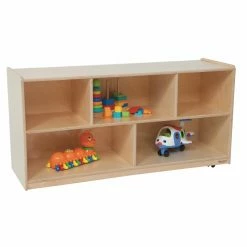 This simple, attractive Wood Designs 42H in. Bookshelf – Natural shows off your child’s toys and books while blending in with the rest of the nursery. Fixed shelves are ideal for holding oversized items, and unlike adjustable shelves, they won’t pull out or collapse when your toddler pulls up on them. The Tuff-Gloss finish resists stains and chemical damage, and it’s easy to wipe clean. The bookshelf’s skirt is even with the floor to prevent small items from being trapped beneath, and corners are smooth and rounded to prevent scrapes and cuts.