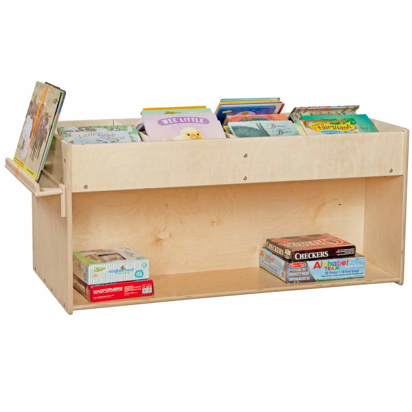 Itβs just like having your very own childrenβs library – just fill the Wood Designs Contender Mobile Book Organizer with your little oneβs favorite storybooks and enjoy. Eight sectioned easels provide ample space for displaying books, while the lower shelves provide storage for everything from board games to puppets to more books. The organizer is crafted of 100% Healthy Kids plywood with an environmentally friendly Tuff Gloss UV finish that wonβt release harmful contaminants (VOCs) into the air. With heavy-duty casters for easy mobility, it can be ordered assembled or ready-to-assemble.