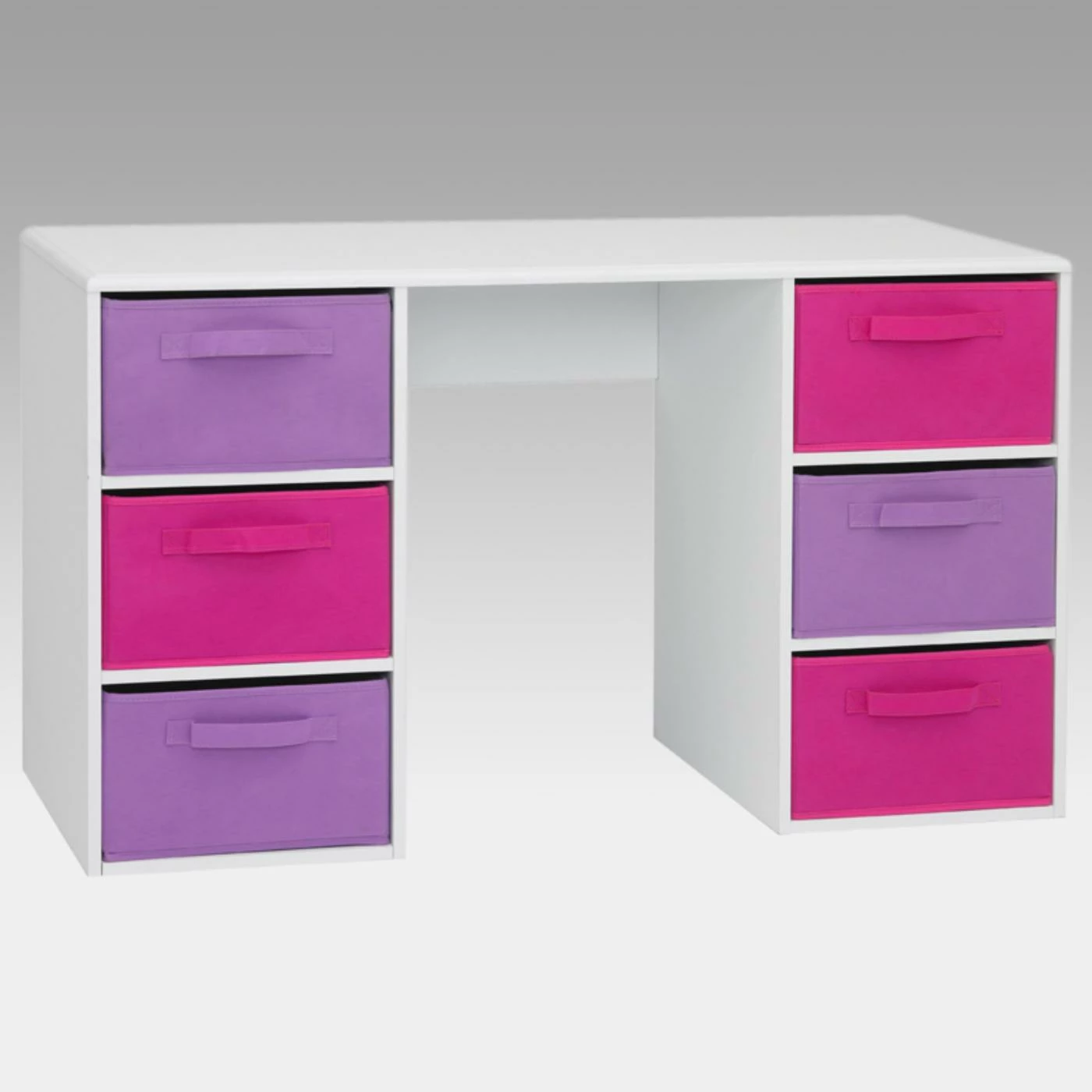 It’s fun to draw, study, or do homework at the 4D Concepts Pastel Student Computer Desk – Pink. Perfect for a girl’s room! The desk has a vacuum formed surface with gently rolled edges for a neatly finished touch. Durable PVC laminate makes this item a great choice for any child’s room; it cleans up easily with a dry non-abrasive cloth. Keep your paper, pens, toys, or CDs handy in the large, pink and lavender folding canvas drawers. The storage is fun and functional. Drawer baskets rest gently on the shelf and have canvas handles on both sides of the drawer to pull out of the unit, or pull out completely to transport to another room in the house. Constructed of wood composite and highly durable PVC laminate. Assembly required.