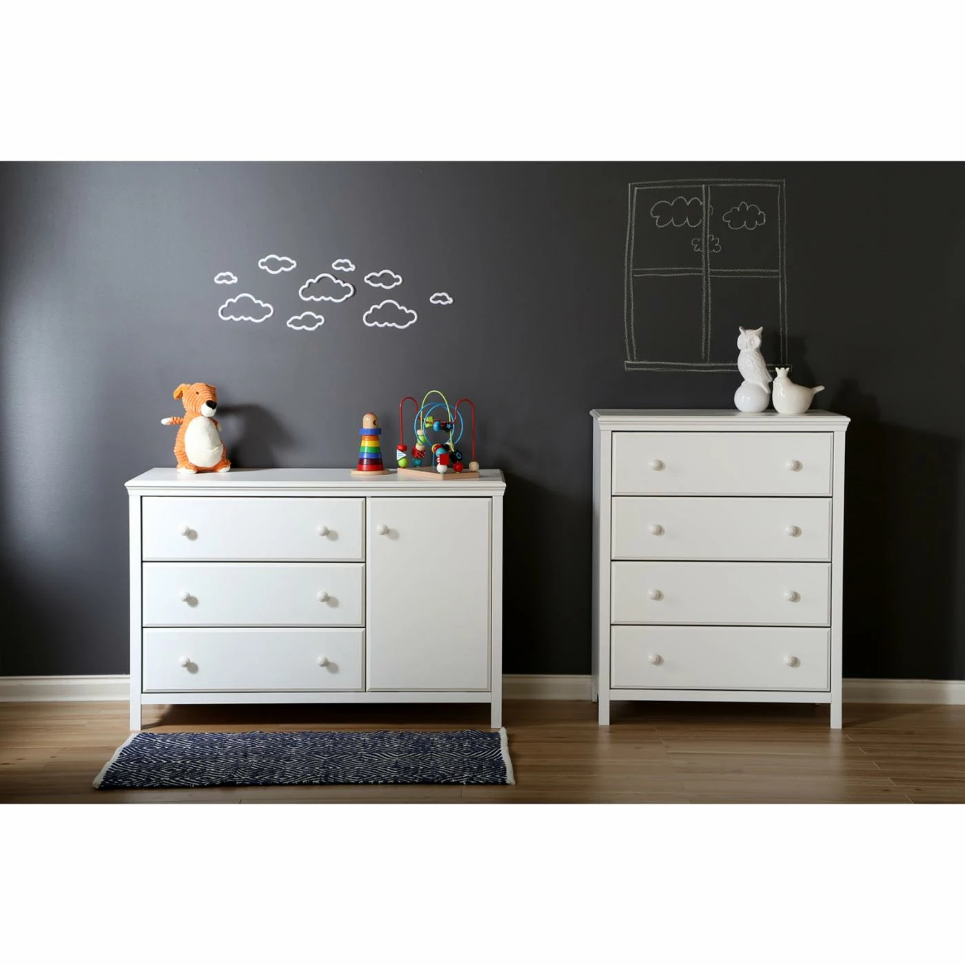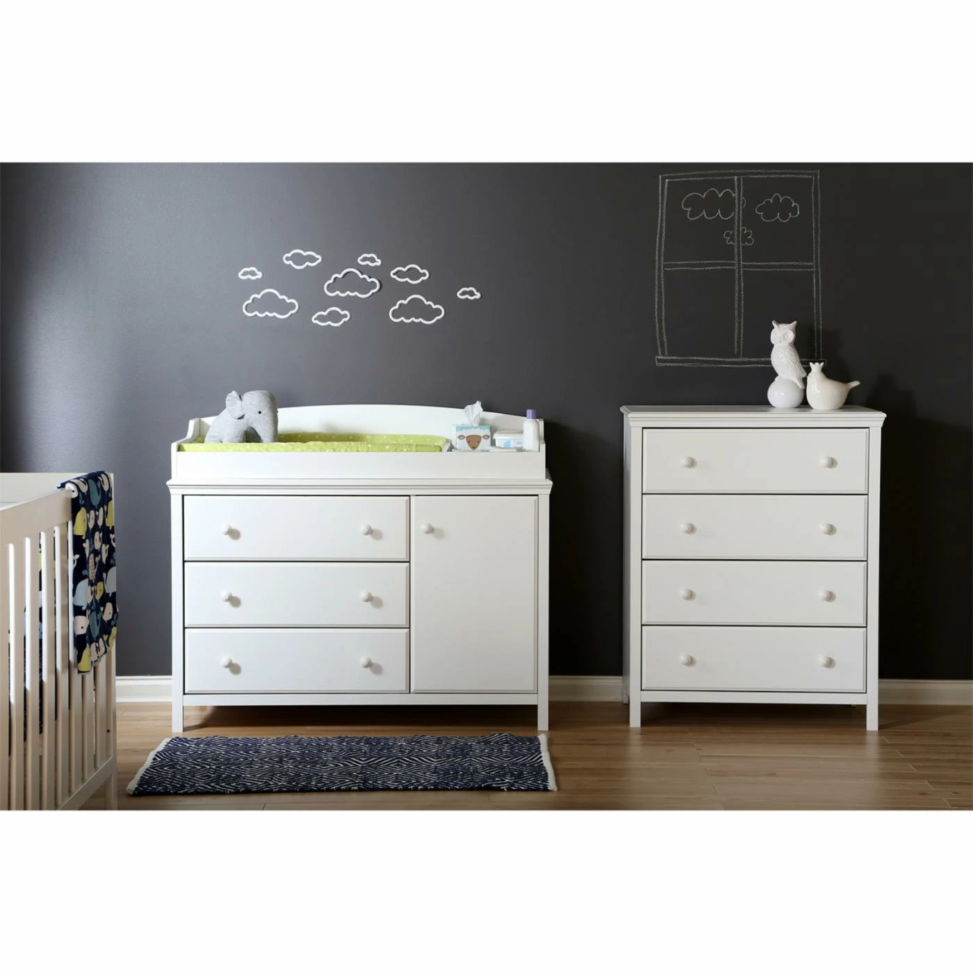 If you need more storage space in your baby room, the Cotton Candy 4-Drawer Chest can give it to you. Four drawers equipped with child-friendly soft-closing mechanisms and safety catches offer plenty of space to store clothing and care items for your little one. Best of all, the traditional-modern design and white finish won’t out go out of style as your child grows. Other features include white ceramic knobs, profiled edges and legs, and decorative molding that frames the drawer fronts.