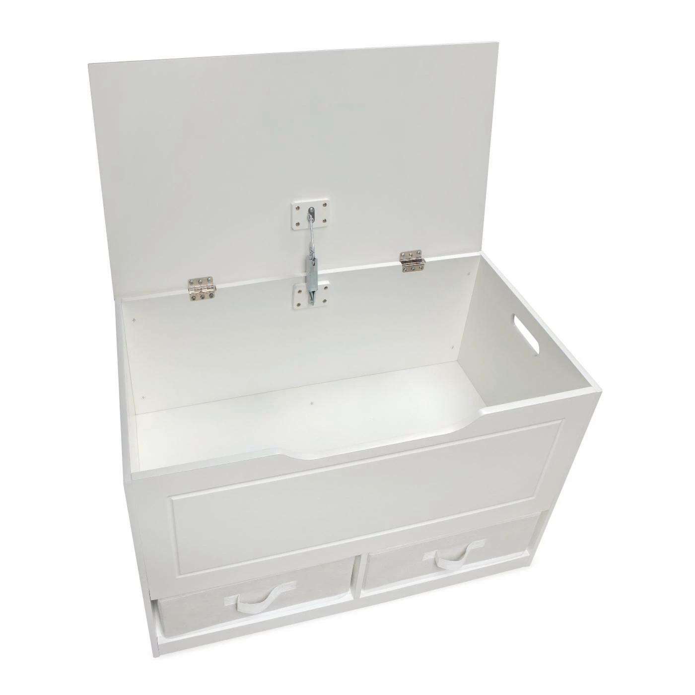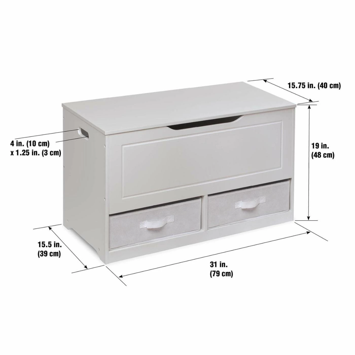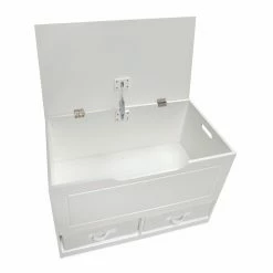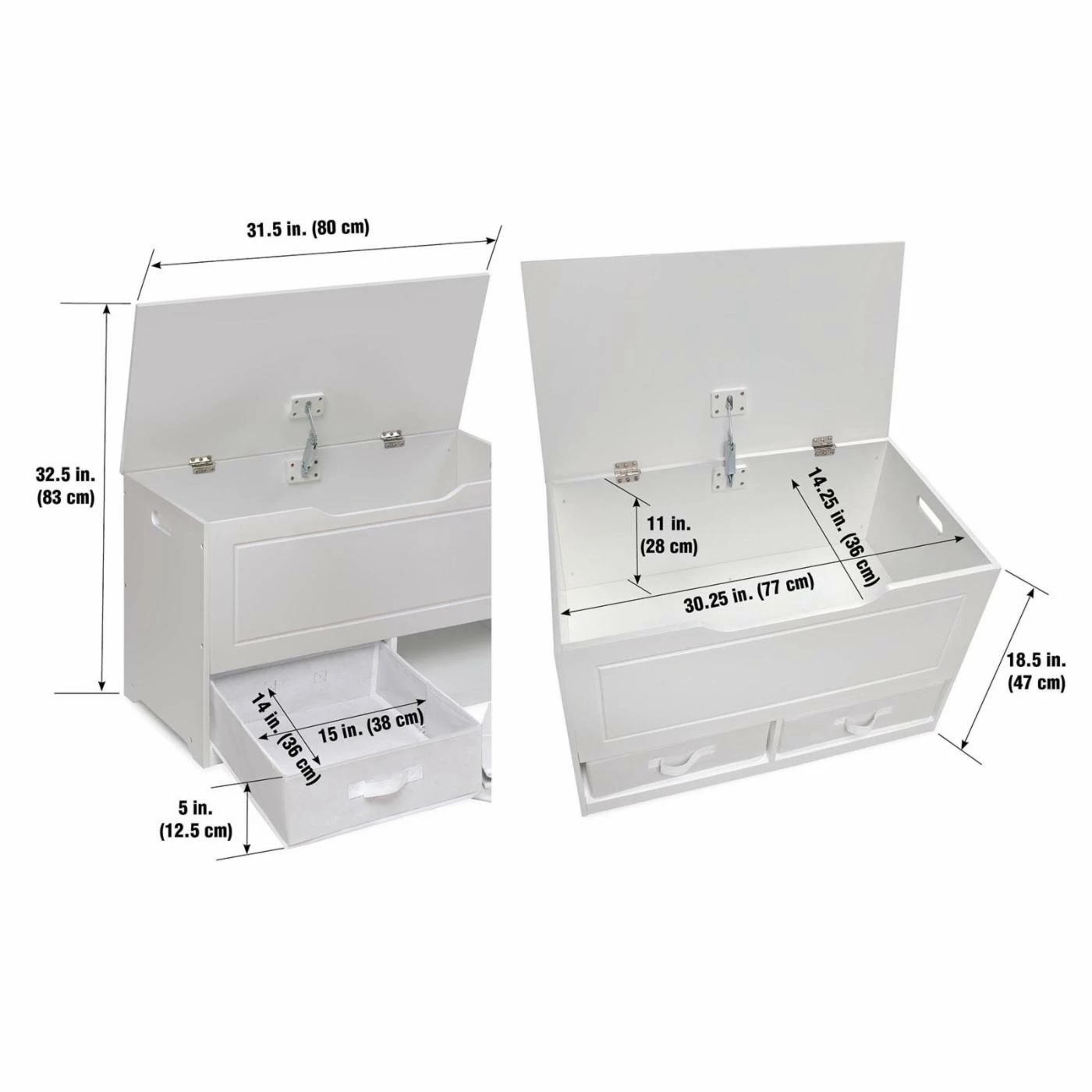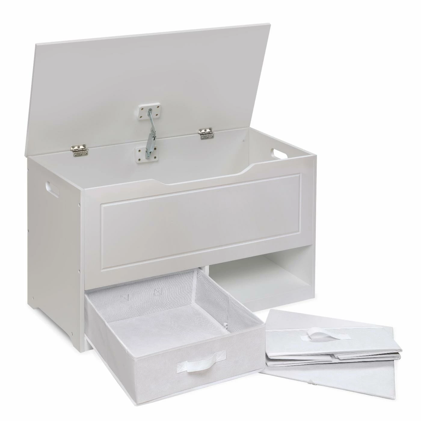 Badger Basket Up and Down Toy Storage Box with 2 Baskets – White handles larger toys in the spacious top bin and small items like doll clothes and building bricks in the two baskets below. No more little, lost pieces at the bottom of the toy chest! Smart design tidies up, sorts, and organizes messy clutter and functions as a kid’s bench. Make room for this versatile storage box in your child’s bedroom, or the playroom, family room, or den. Place it at the end of a bed, or under a window, and take a seat to read, have a time-out breather, or put on socks and shoes. Use it to store linens and supplies in a guestroom and visitors will appreciate it as place to put suitcase. Makes a perfect dress-up clothes chest! Costumes in the top and play jewelry and accessories underneath! Quality hardware with a safety support hinge that holds the lid open, preventing slamming, finger crushing, or pinching. Side handles make it easy to move around when vacuuming or rearranging furniture. Handle opening on the front under the lid is a convenient way to lift up the top, and prevent injury when shutting it. Reverse the two-color baskets to customize the look! You may choose not to use the baskets and instead have open cubbies, perfect for books, games, and puzzles. Front and back handles on the baskets eliminate any struggle pulling them out and carrying them around. Rear panel keeps the baskets in place. The Up and Down Toy Box is just the right height for kids to easily access their toys, and it’s conveniently down at their level so they can efficiently clean up. Smooth surfaces, with grooved detail on the front, are easy to clean and maintain. Lid opens to full vertical allowing easy access to the 2.75 cubic feet of space inside. Made with engineered wood with a non-toxic painted finish. Baskets are made with non-woven fabric, 80% Polyester/20% Cotton fabric, and industrial cardboard.