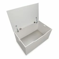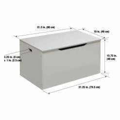Badger Basket Woodgrain Flat Bench Top Toy Storage Box – White brings order to a large assortment of toys, or blankets and towels in a guest room, or use it to control frustrating clutter wherever it gathers around the house. Simple, functional design, with clean lines, sits quietly in any living area, such as bedrooms and playrooms. Bench top is great for children as a reading seat, time out spot, or handy place for kids to sit down for putting on shoes. Visiting guests will appreciate it as a surface to support their suitcase. Children will learn how easy it is to clean up and keep their special things in one, orderly place. Quality hardware with two safety support hinges that hold the lid open, preventing slamming, finger crushing, or pinching. Reinforced side handles make it easy to move around when vacuuming or rearranging furniture. Handle opening on the front under the lid is a convenient way to lift up the top, and prevent injury when shutting it. Smooth surfaces are easy to clean and maintain. Lid opens to full vertical allowing easy access to the impressive 4.5 cubic feet of space inside. Made of engineered wood with anti-scratch, woodgrain, melamine lamination. Bottom board has paper lamination.