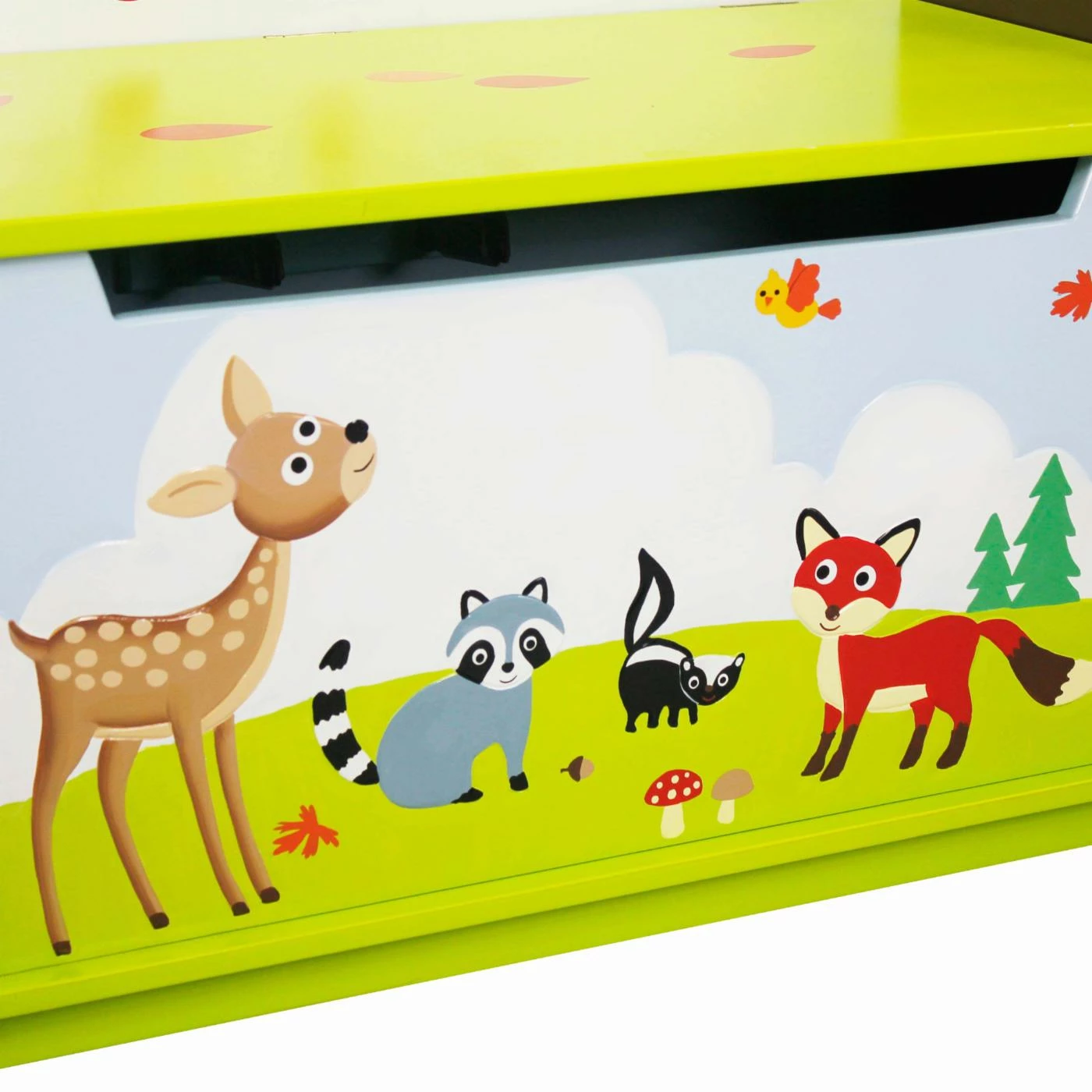The Fantasy Fields Enchanted Woodland Toy Chest makes keeping the floor of your child’s bedroom free of clutter a breeze. Board games, action figures, dolls, books, and more can all be scooped up and deposited into this toy chest at bedtime for playtime another day. The frame of the chest is hand-carved from medium-density fiberboard for a lightweight, durable design. The lid is outfitted with safety hinges to prevent it from slamming on fragile fingers. Cut-out side handles make moving the chest a snap. Nontoxic, water-based paint is hand-applied to the frame in vibrant colors, depicting a happy woodland design with a field and animals (a deer, skunk, raccoon, and fox) on the base of the trunk and a pair of owls on the back.