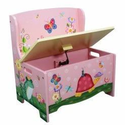 In the bedroom or the garden, the Fantasy Fields Magic Garden Storage Bench provides a durable, comfortable seat for your child to enjoy. This enchanting bench is supported by a solid wood and medium-density fiberboard frame, featuring a large seat that lifts to reveal a roomy storage area beneath, perfect for toys, gardening supplies, and more. A safety hinge prevents the lid from slamming shut, protecting little fingers. Side handles are included to make moving the bench effortless. The exterior of the frame comes hand-painted in a water-based, nontoxic pastel pink and patterned with a variety of garden creatures, including a turtle and ant on the front, a frog on the side, and flowers and butterflies all over.