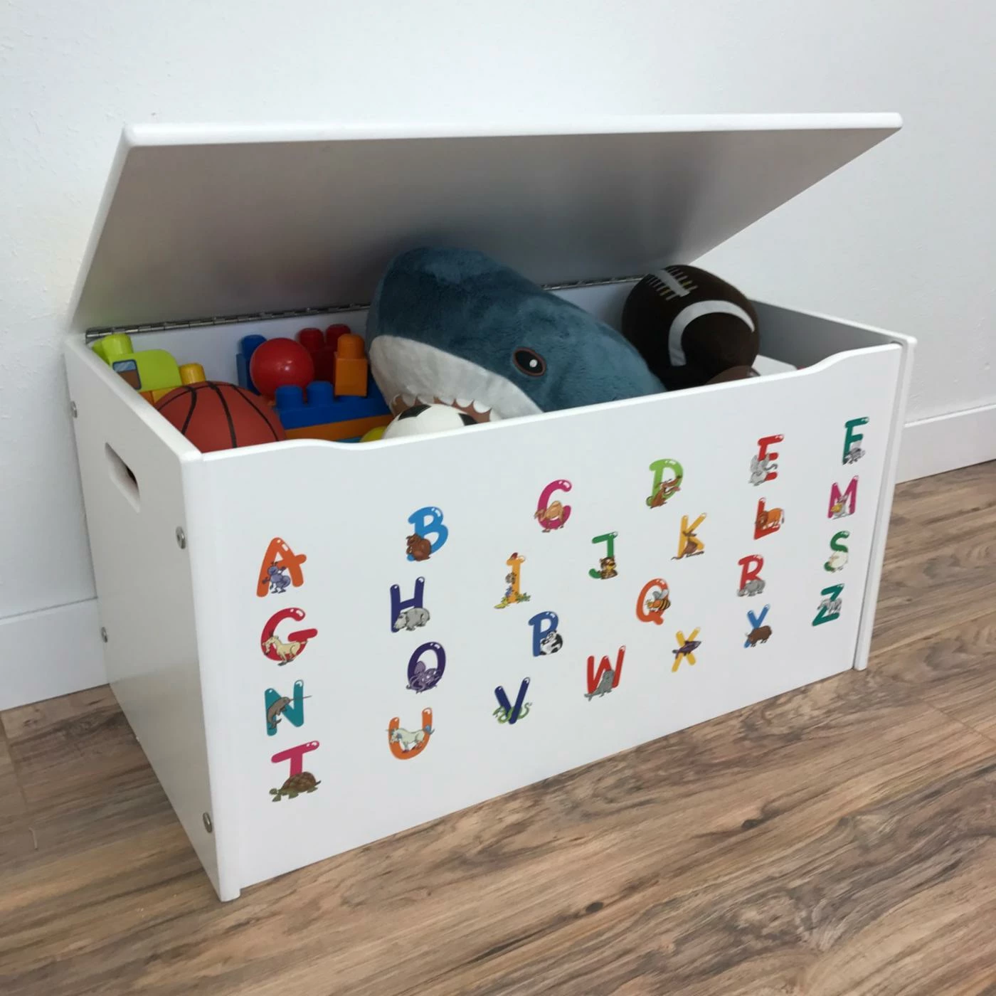 From sports equipment to action figures, dolls, and more, the Little Colorado Little Prints Animal Alphabet Toy Storage Box is an essential component to any child’s bedroom to help keep the floor clean and tidy. The frame of this toy storage box is constructed from tough engineered wood with cut-out side handles and a recessed front finger cut-out to prevent pinching. A smart hinge outfits the lid, keeping it open at any angle. The piece is finished in bright white with a multicolored alphabet design on the front with each letter represented by a playful animal.