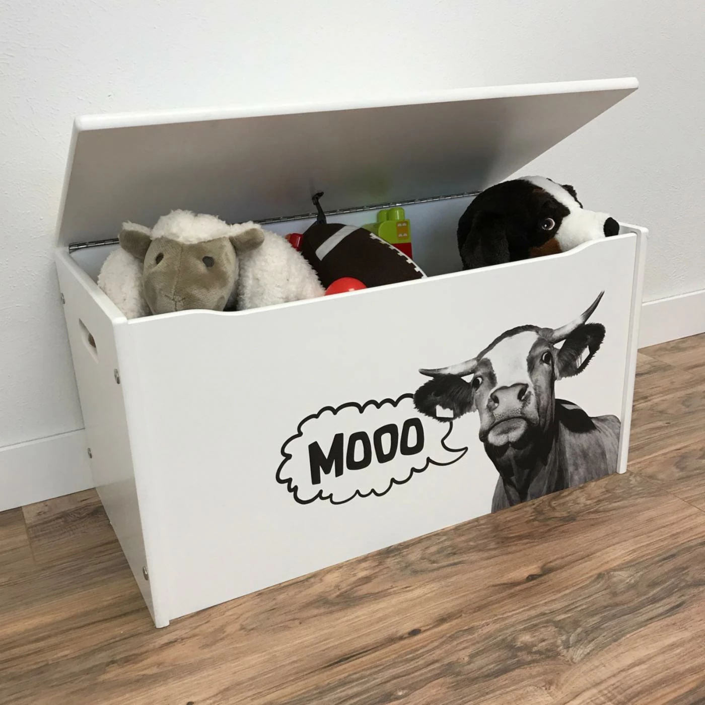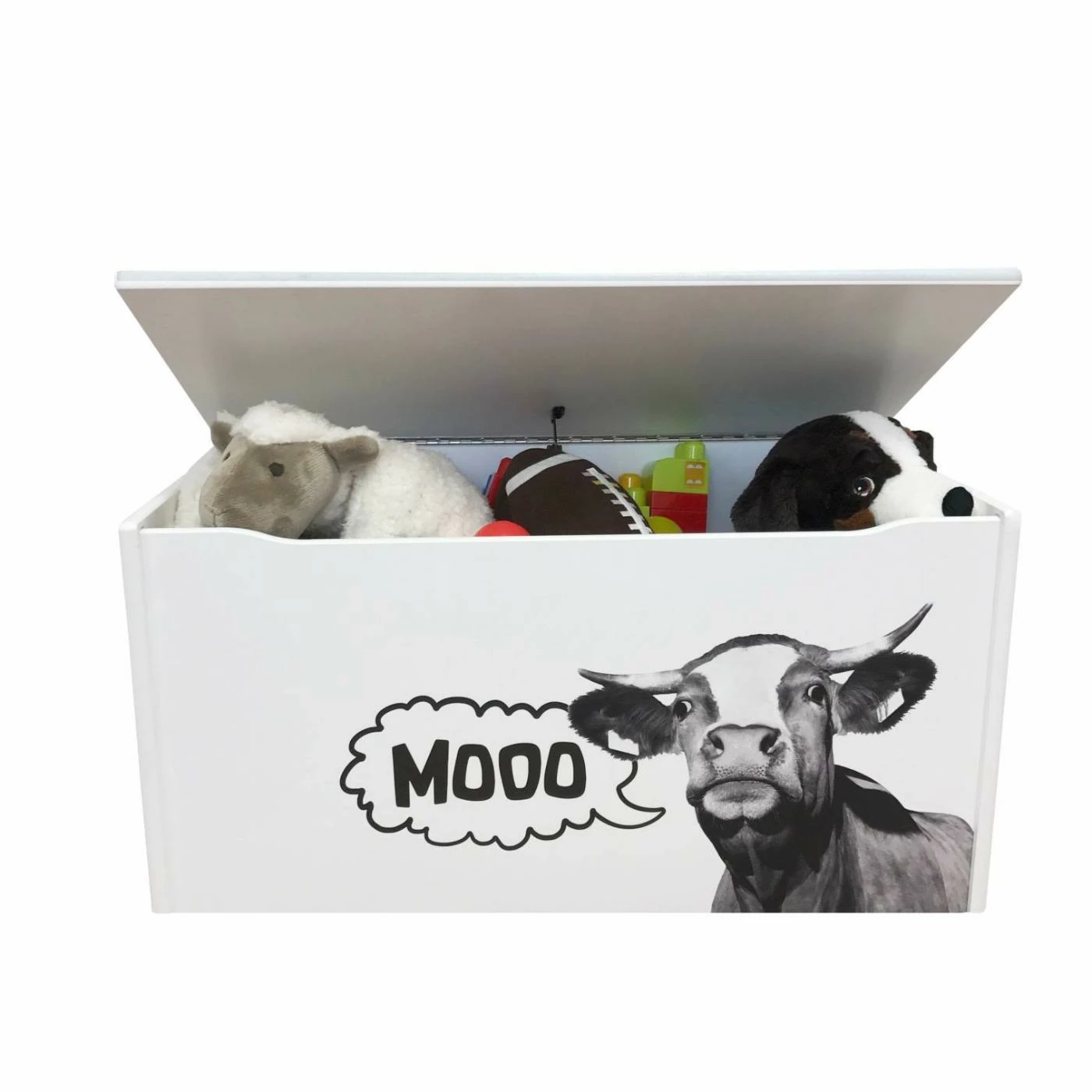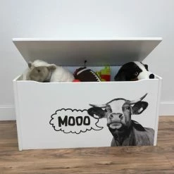 Give your playroom a playful and functional accent with the Little Colorado Little Prints Mooo Toy Storage Box. This toy box features a durable frame crafted from engineered wood with rounded edges, a recessed front finger cut-out, and cut-out side handles for safety. The lid is equipped with a never-slam hinge that keep the lid open at any angle. A crisp white finish tops the frame, featuring a photo-realistic black-and-white image of a cow on the front, complete with a moo speech bubble.