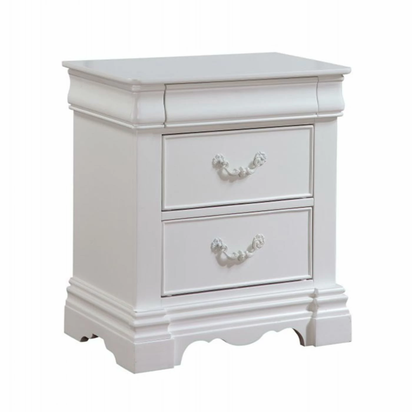 A charming addition to any bedside, the Acme Furniture Estrella Kids 2 Drawer Nightstand features crown molded details and decorative hardware. The white finish is right at home in many a kids’ bedroom, and the three drawers, two with white-finished hardware and one concealed, offer ample storage for books, eyeglasses, and other bedside essentials.
