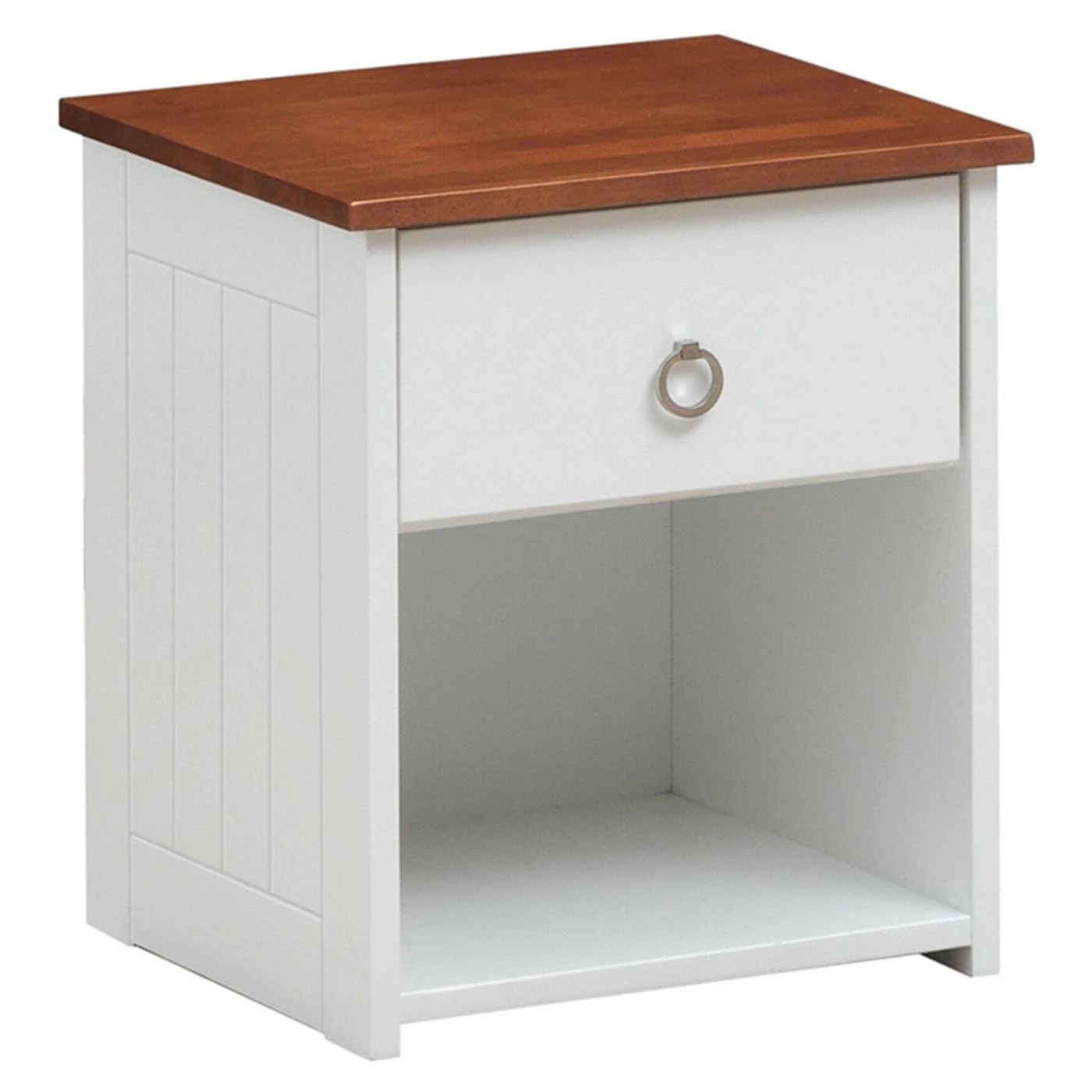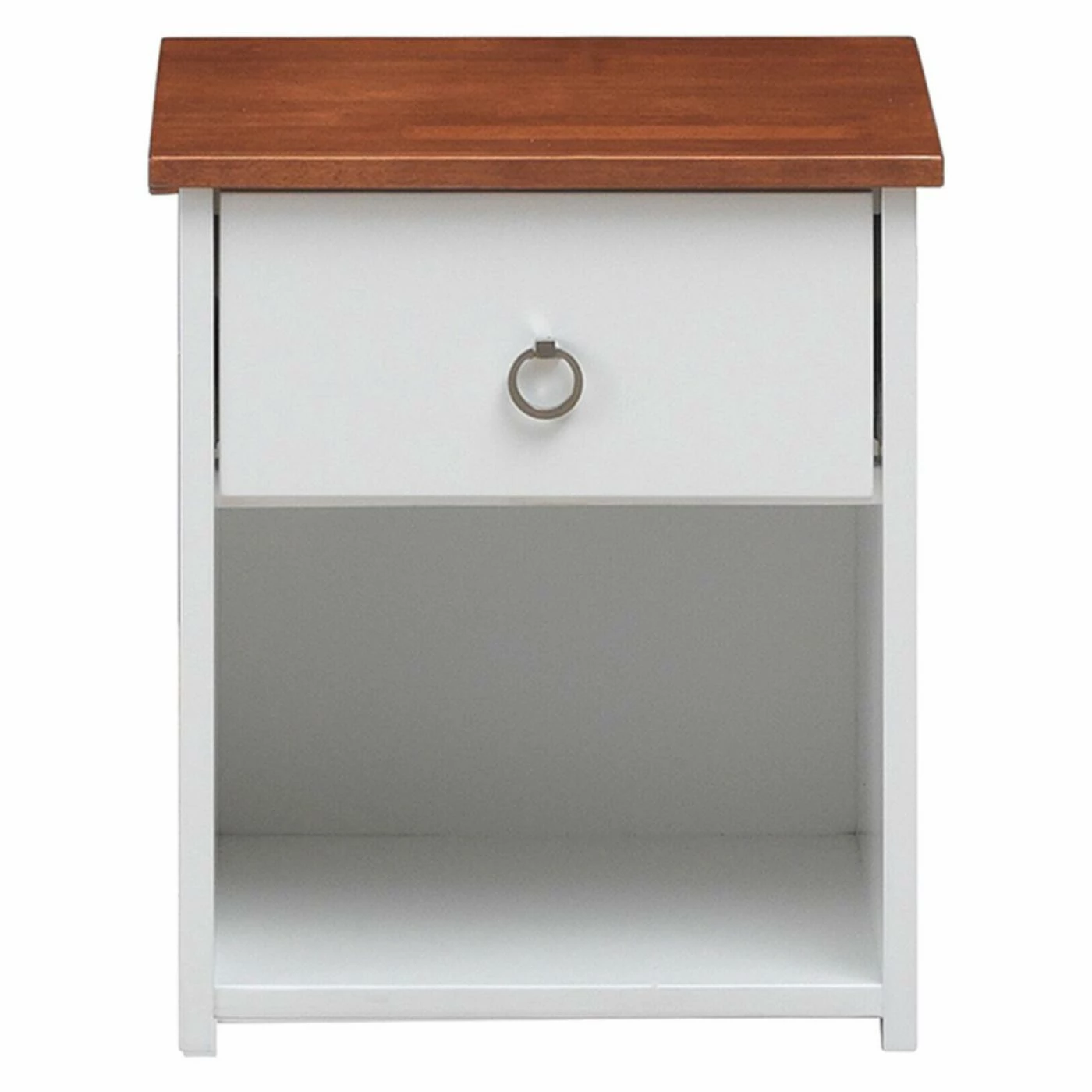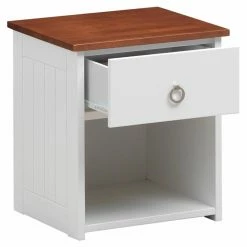 Give your childโs bedroom a fetching farmhouse-style makeover starting with the Acme Furniture Farah 1 Drawer Kids Nightstand. This nightstand comes crafted from durable wood with a creamy cottage white finish. The top surface is finished in rich brown for a two-tone contrast. For storage, a tall, deep drawer is built into the face, outfitted with ball-bearing glides and a ring handle. An open shelf space is incorporated into the base, ideal for a storage basket or decorative plant.