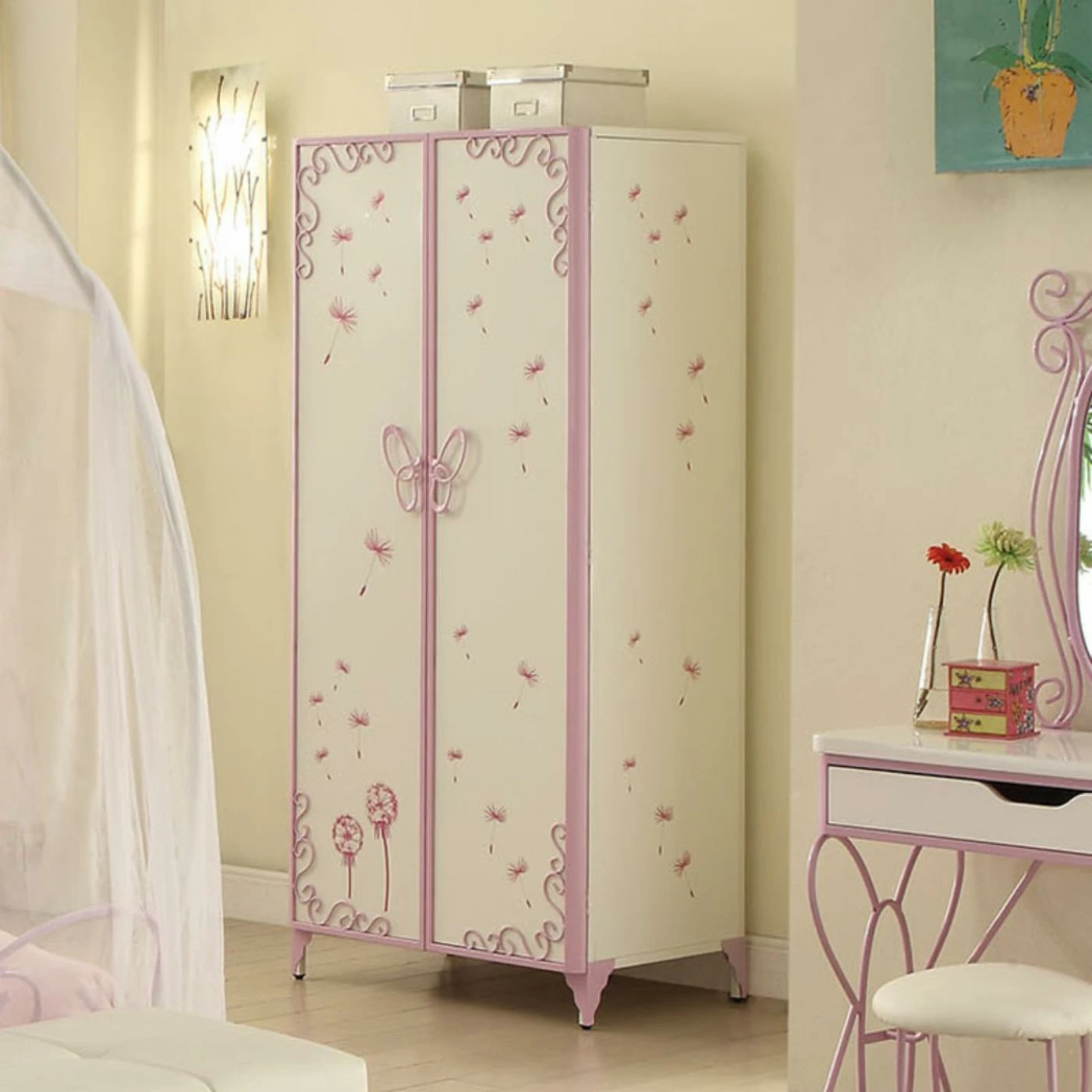The Acme Furniture Priya II Armoire is a decidedly dainty addition to your little girl’s room. It’s constructed of sleek metal and covered in shades of white and purple. An adorable butterfly handle rests on the front and opens the wardrobe to reveal a roomy closet space to hang clothing. Loads of floral and butterfly images adorn the exterior of this armoire.