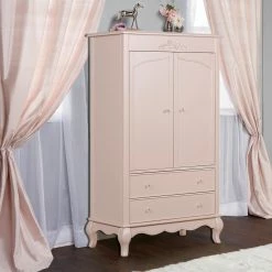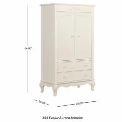 The Victorian style Evolur Aurora 2 Drawer Armoire is crafted from kiln-dried hardwood with soft, feminine carvings, Queen Anne style feet, and intricate ribbon and bow scrollwork, enhanced with your choice of available finishes. Straight from the pages of a fairytale, this enchanting design is sure to make your little girl feel like a princess. But it’s more than just good looks that this armoire has to offer! The design includes two drawers, one garment rod, and two removable shelves behind doors accented with crystal and metal knobs.