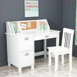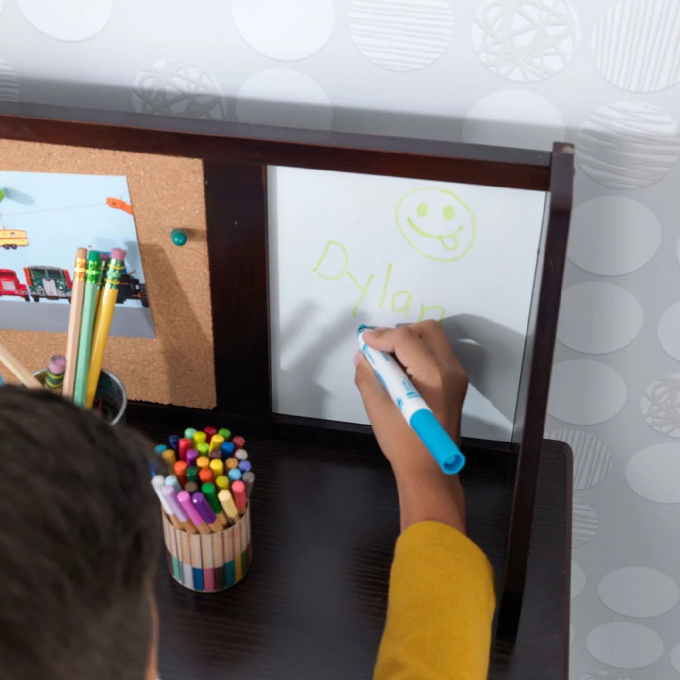 It’s well known that kids do their best work in a dedicated workspace. Provide that space with the KidKraft Study Desk with Drawers. Rife with organizational features, this desk is a perfect spot for art projects, homework, crafts, and more. With three easy-glide drawers, a cork bulletin board, and three pigeonhole compartments, the desk makes staying organized a breeze. Engineered wood with an espresso finish makes for a sturdy piece that coordinates with most decors. Includes a classically styled child-sized desk chair. Recommended for ages 3 and older.